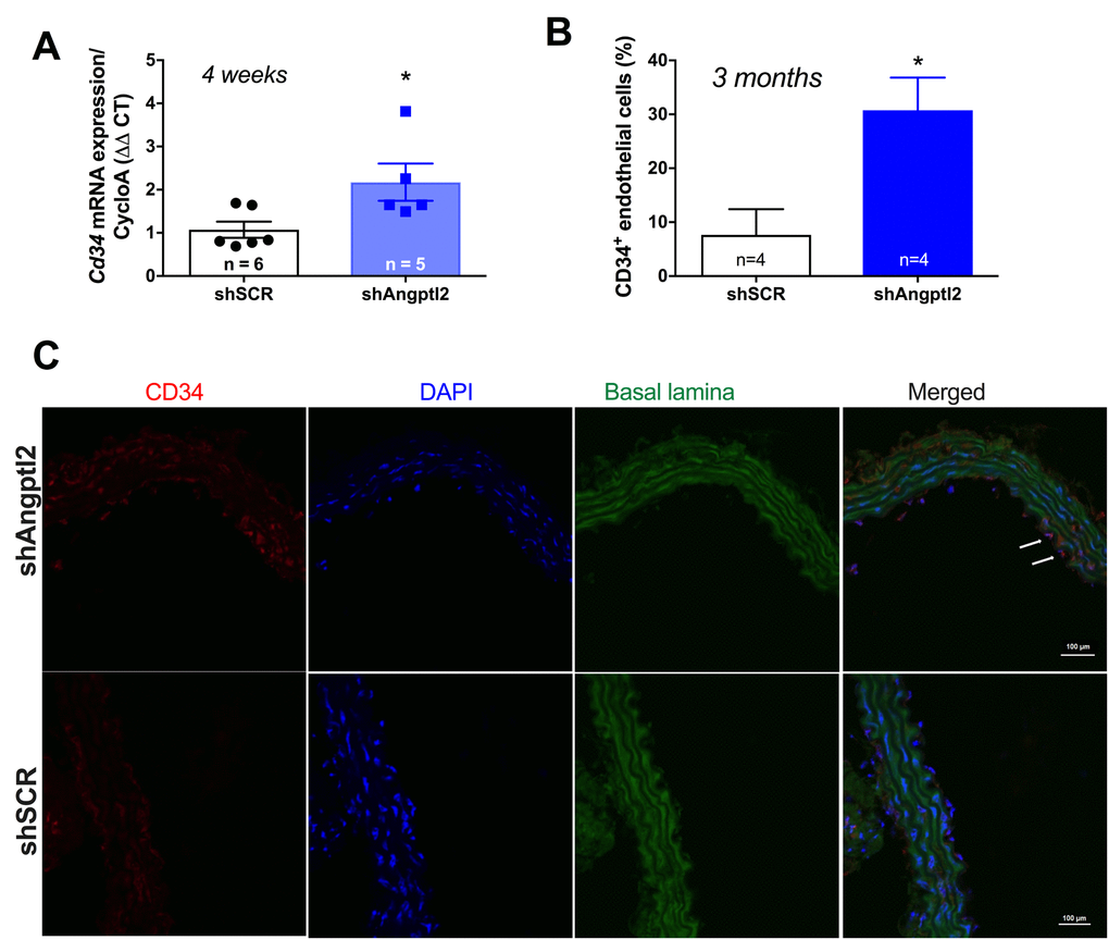 Since the shAngptl2 therapy is anti-atherogenic, it would be expected that endothelial repair occurred as a mean to restore and/or maintain endothelial functions. After 2 weeks of shAngptl2 treatment, Cd34 expression tended to increase in the endothelium (from 1.1±0.3 to 1.9±0.3, p=0.082, n=5 and 7, respectively; data not shown), and after 4 weeks Cd34 expression increased significantly (p=0.034) (Figure 8A). This increase in the marker of progenitor cells, suggesting Cd34+ progenitor cell recruitment, was maintained up to the end of the study period, i.e. 3 months post-injection (Figure 8B-C). In contrast, endothelial apoptosis was no longer observed 3 months post-injection (data not shown). This strongly suggests that rapid apoptosis of angptl2+ senescent EC stimulates long-term endothelial repair, at least in part by incorporating circulating endothelial progenitor cells (CD34+ EpC).
