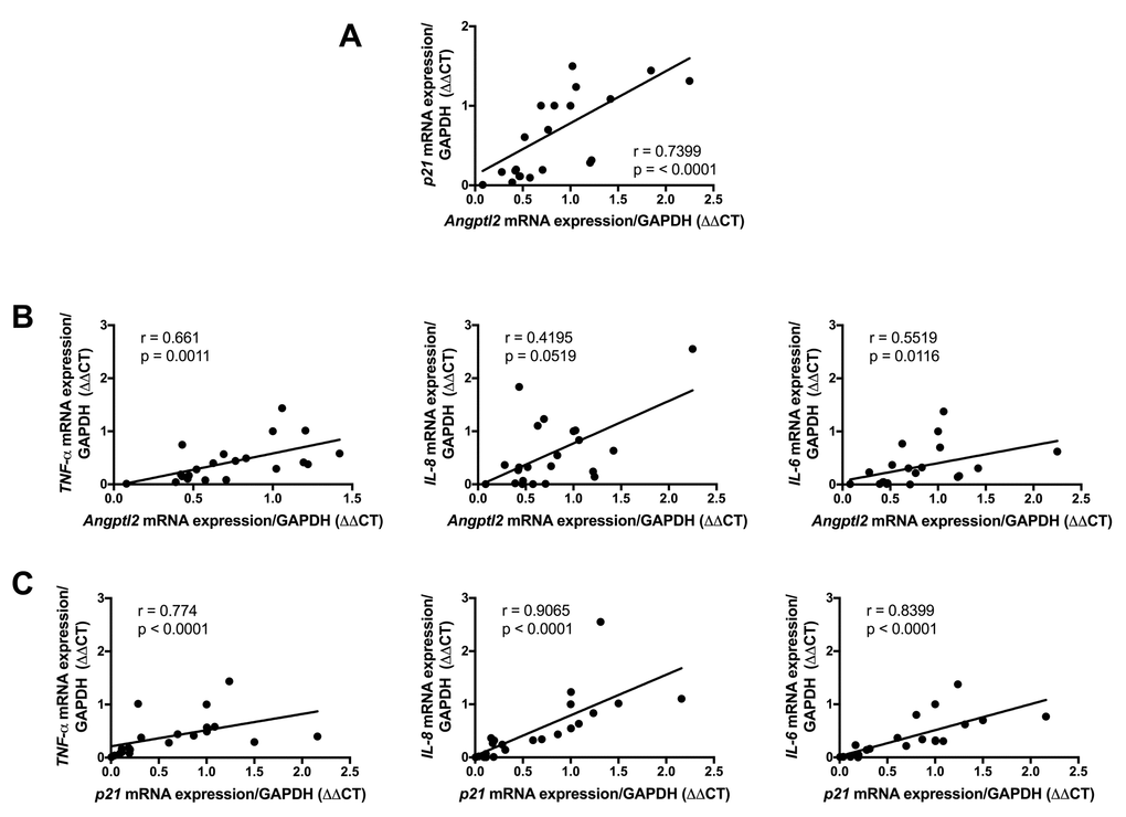 To validate the clinical relevance of ANGPTL2 as a marker of vascular senescence, and to assess whether accumulation of senescent cells precedes plaque growth in human arteries, we measured the expression of ANGPTL2 and markers of senescence in human arterial segments. We recruited 26 patients undergoing coronary artery bypass (CABG) surgery with or without valve replacement (characteristics of the patients are in Table S2). In internal mammary artery segments free of plaque, the expression of p21 and that of ANGPTL2 were tightly associated (Figure 9A) and did not correlate with the age of the donor (data not shown). Furthermore, ANGPTL2 and p21 levels correlated with pro-inflammatory cytokines of the SASP, i.e., TNFα, IL-8 and IL-6 levels (Figure 9B-C). These clinical data validate the strong link between vascular ANGPTL2 and the marker of senescence p21, in yet non-atherosclerotic arteries, independently of age. These data also suggest that accumulation of senescent vascular ANGPTL2+;p21+ cells might precede plaque growth in human arteries.