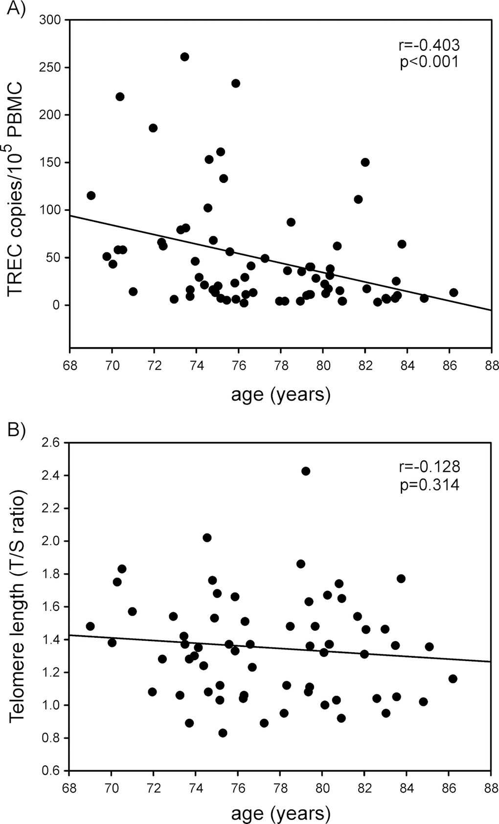 In the previous study, we found that low TREC levels and low telomere length, markers of low thymic function and replicative senescence respectively, are associated with a higher risk of tumor onset [7]. In the present population of cancer patients, in agreement with the previous study, we found that TREC levels decline with age, while telomere length does not. However, both these parameters lack of prognostic role for disease outcome in elderly cancer patients.