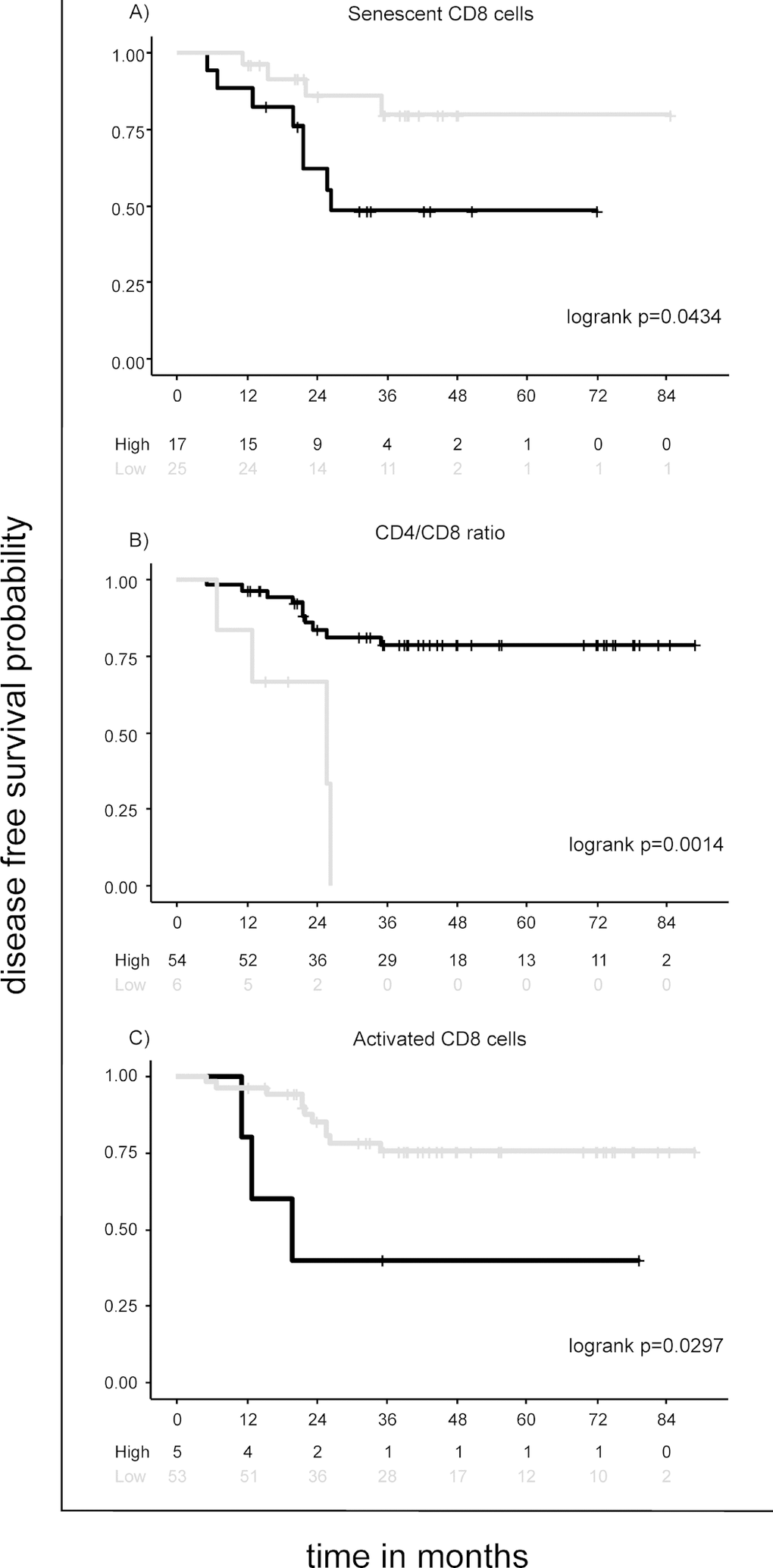 CD4/CD8 ratio has been used as a surrogate marker of immune senescence in the general population [11]. Several studies have identified that CD4/CD8 ratio decrease over the lifespan, and inversion of the CD4/CD8 ratio in the elderly has been associated with risk of frailty and chronic viral infections, such as cytomegalovirus [24,25]. In this study, we first described that a low CD4/CD8 ratio is a prognostic marker of disease relapse in I-III staged patients. Interestingly, also high percentages of CD8 RTE lymphocytes were associated with a poor clinical outcome in these patients. It has been reported that RTE cells, recently emigrated from the thymus, are lower in cancer patients than in controls [7]. We can speculate that the high levels of senescent and activated CD8 cells in patients with progression of disease may induce a recall of new CD8 cells from the thymus. Increased levels of senescent, activated and RTE CD8 cells contribute to the low CD4/CD8 ratio.