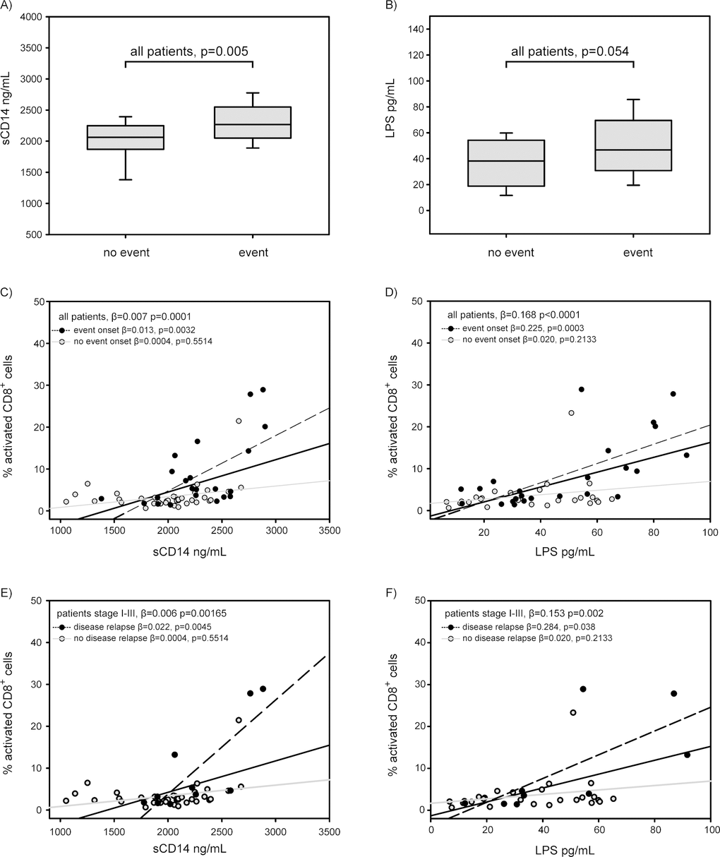 Circulating levels of sCD14 and LPS were significantly increased with increasing percentages of activated CD8 cells in all patients (regression coefficient β=0.007, p=0.0001 for sCD14, and β=0.168, p<0.0001 for LPS) (Figure 3C and D). Notably, both sCD14 and LPS were strongly associated with activated CD8 in the group of patients who will experience a negative event (β= 0.013, p=0.0032 for sCD14, and β= 0.225, p=0.0003 for LPS), but not in the group of patients who will not (β=0.0004, p=0.5514 for sCD14, and β=0.020, p=0.2133 for LPS) (Figure 3C and 3D). Moreover, also in 61 I-III staged patients, levels of sCD14 and LPS were significantly increased with increasing immune activation. In particular, circulating levels of sCD14 and LPS were associated with increased percentages of activated CD8 in patients who will have a disease relapse (β= 0.022, p=0.0045 for sCD14, and β= 0.284, p=0.038 for LPS). (Figure 3E and 3F).