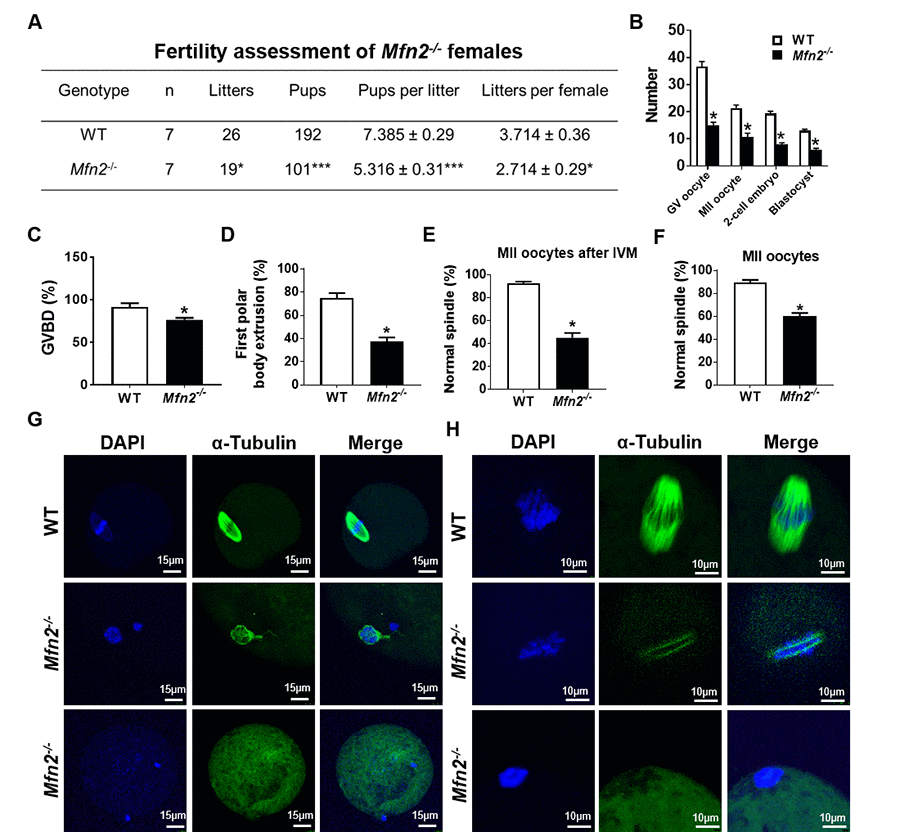 All animal care and experimental procedures were conducted in accordance with Yale University animal research requirements under the protocols approved by the Institutional Animal Care and Use Committee (protocol # 2017-11207). Mfn2flox/flox mice (stock number 026525) and Zp3-Cre mice [19,20] (where Cre is driven by Zp3 promoter) in C57BL/6 background (stock number 003651) were purchased from The Jackson Laboratory. Mfn2flox/flox mice were crossbred with Zp3-Cre mice to produce mice with oocyte-specific Mfn2 deletion (Mfn2fl/fl/Zp3-Cre mice), and for simplicity, they are referred to as Mfn2-/- mice hereafter. Genotyping was carried out using the primers shown in Supplementary Table 1.