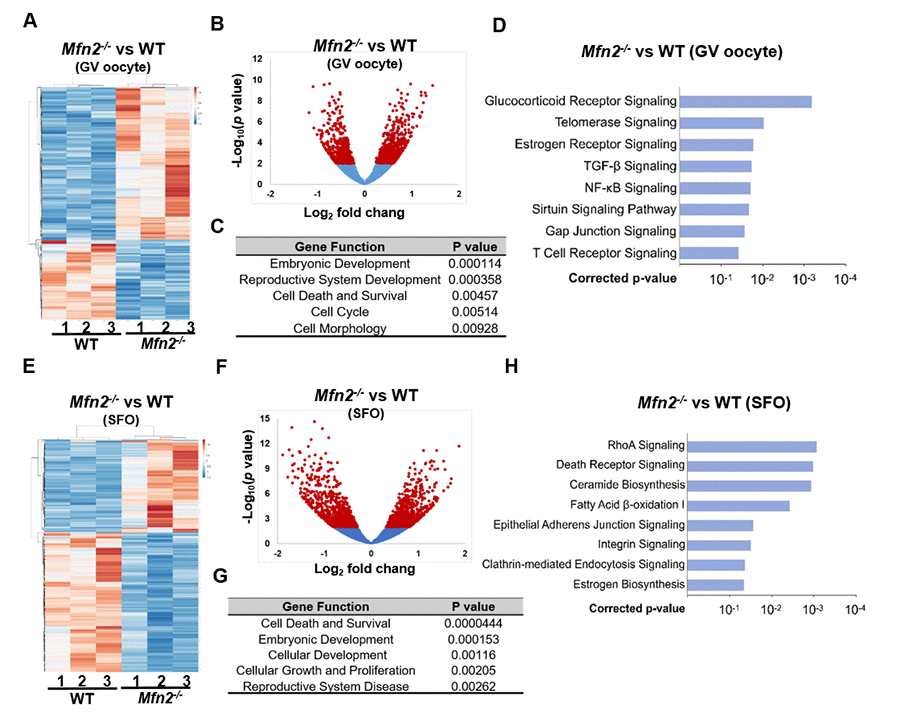 To delineate the genes and pathways affected in MFN2-deficient oocytes, RNA sequencing (RNAseq) analysis was performed in GV oocytes and secondary follicle enclosed oocytes (SFOs) derived from Mfn2-/- and WT mice. Hierarchical clustering of the differentially expressed genes partitioned into two distinct clusters to separate Mfn2-/- and WT GV oocytes (Figure 3A). A total of 363 genes were significantly differentially expressed (p<0.05) in Mfn2-/- compared to WT GV oocytes, with 241 up-regulated and 122 down-regulated genes (Figure 3B). Gene ontology (GO) analysis indicated significant over-representation of elements involved in regulation of embryonic development, cell death and survival, and cell morphology (Figure 3C). Most significantly regulated pathways in Mfn2-/- GV oocytes were listed in Figure 3D. Notably, telomerase signaling pathway and sirtuin signaling pathway were affected (Figure 3D).