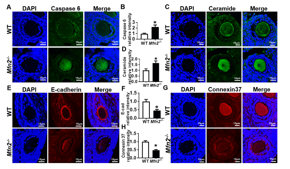 Mfn2-/- secondary follicle-enclosed oocytes show increased apoptosis associated with elevated levels of ceramide and decreased expression of E-cadherin and Connexin 37