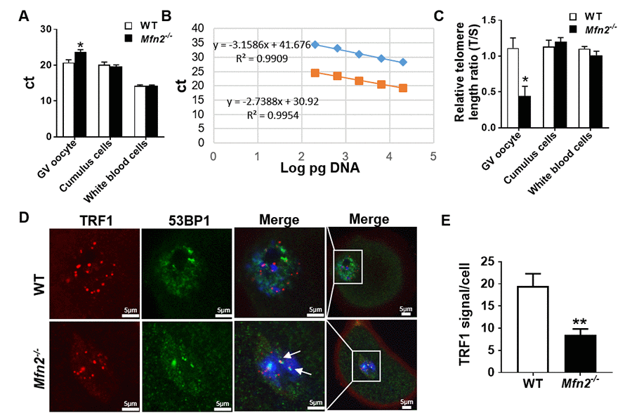 Mfn2-/- GV oocytes have shortened telomeres with decreased expression of telomere protective protein TRF1