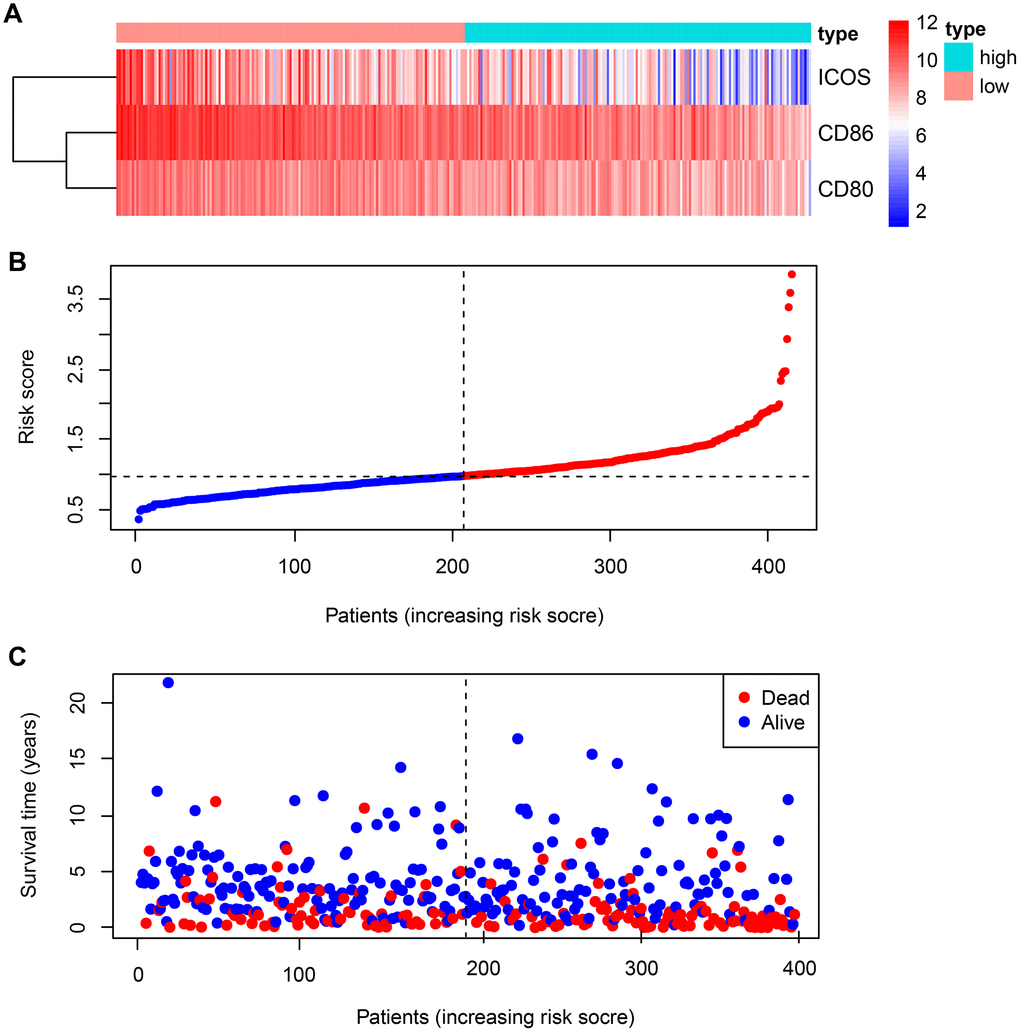 Univariate Cox regression analysis was used to estimate the expression of each B7-CD28 family gene; genes with P < 0.05 were defined as survival-associated genes. The survival-related genes then were incorporated into a Cox proportional hazard regression model to establish a risk score equation. Risk scores were calculated for each patient; patients were then separated into high-risk and low-risk groups using the median risk score as the cutoff point. The Kaplan-Meier method was used to estimate and verify OS, and the log-rank test was used to compare survival differences between groups. Data were analyzed using SPSS version 21.0 and R software version 3.5.2, and a value of P < 0.05 was considered statistically significant.