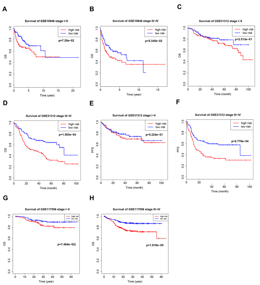 Patients with stage I–II cancer have a very different prognosis than patients with stage III–IV cancer, and the efficacy of different treatment methods and cycles depends on stage. We therefore evaluated B7-CD28 gene expression patterns at different cancer stages separately in high-risk and low-risk patients. Our model accurately predicted OS and PFS in stage III–IV patients, but its predictive accuracy was relatively poor in stage I–II patients (Figure 4).