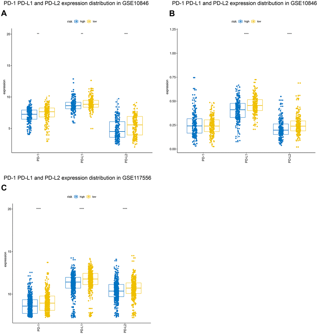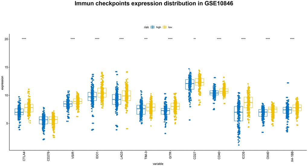 For some tumors, immunotherapy targeting PD-1 and PD-L1 is more effective in patients with high expression of these genes than in patients with low expression [15, 16]. We evaluated PD-1, PD-L1, and PD-L2 expression in the high-risk and low-risk groups. Both PD-L1 and PD-L2 expression were higher in the low-risk group in all three patient cohorts, and PD-1 expression was higher in low-risk patients in the GSE10846 and GSE117556 cohorts. PD-1 and PD-L1 inhibitor therapy may therefore be more effective in low-risk group patients (Figure 8). We also examined the expression of several costimulatory (including CTLA4, CD276, VSIR, IDO1, LAG3, and TIM-3) and coinhibitory (including GITR, CD27, CD40, ICOS, OX40, 4-1BB) checkpoint genes the GSE10846 (Figure 9), GSE31312 (Supplementary Figure 2), and GSE117556 (Supplementary Figure 3) cohorts. Drugs that targeting these checkpoints have been developed, but are either not yet widely used or still in early stages of the clinical trial process. We found that expression of most of these checkpoint genes differed significantly between the high-risk and low-risk groups. B7-CD28 gene family expression patterns might therefore aid in selecting ideal immunotherapies for individual patients in the future.