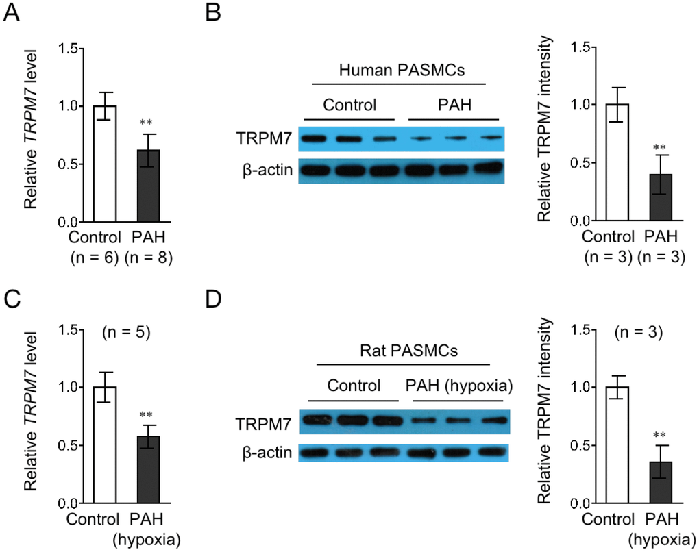 TRPM7 downregulation in PAH PASMCs from human and an animal model