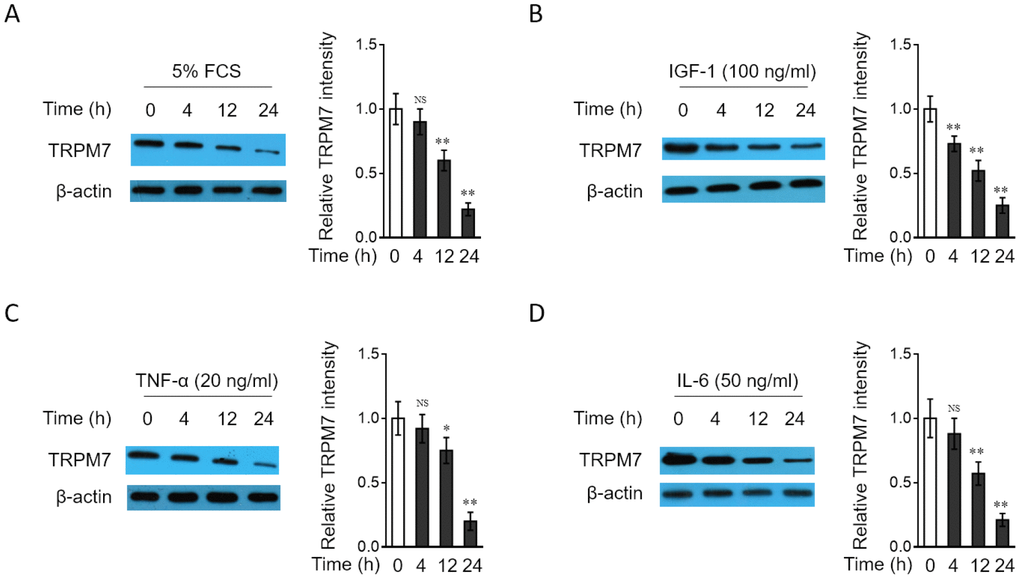 To test whether the downregulation of TRPM7 expression in PAH PASMCs is related to the stimulation by PAH stimuli, we cultured the rat normal PASMCs in vitro in medium containing various relevant PAH stimuli, such as 5% fetal calf serum (FCS) or different growth factors and cytokines, including IGF-1, TNF-α or IL-6, all of which have been shown to be pro-hypertensive [44]. As results, we found that the expression of TRPM7 in PASMCs was decreased in a time-dependent manner when treated with 5% FCS (Figure 2A), IGF-1 (Figure 2B), TNF-α (Figure 2C) and IL-6 (Figure 2D). These data not only suggest that TRPM7 expression in PASMCs could be downregulated in response to PAH stimuli, at least in vitro condition, but also hint that TRPM7 downregulation in PAH PASMCs may be caused by the stimulation of PAH stimuli present in focal sites.