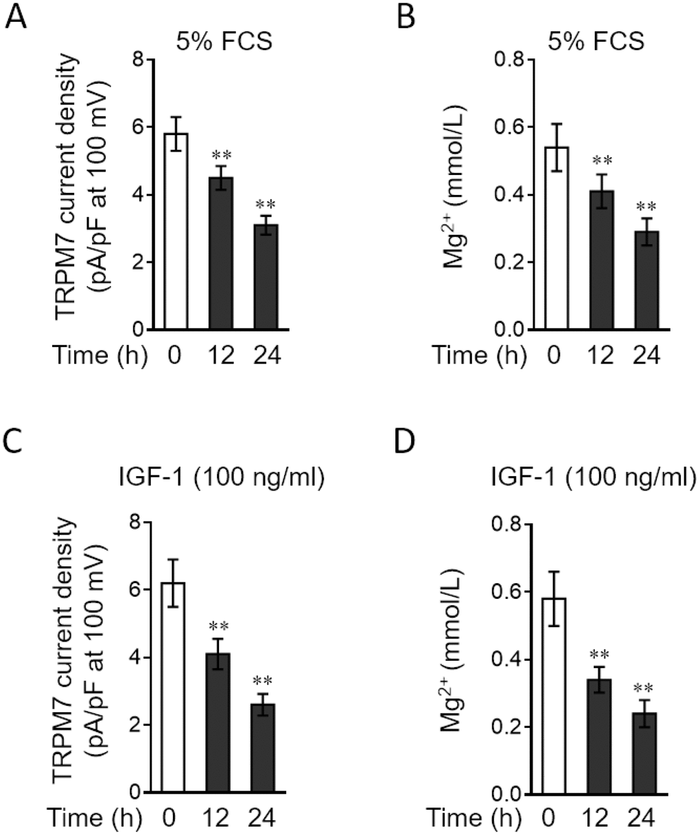 TRPM7 functions as a cation channel that promotes vascular magnesium transport and homeostasis [24, 25]. Since TRPM7 expression is downregulated in PASMCs stimulated by relevant PAH stimuli, we asked whether TRPM7-mediated magnesium transport is also impaired in PASMCs under these conditions. To test this possibility, we applied the whole-cell patch-clamp technique to record TRPM7 currents and also compared free intracellular magnesium concentration in PASMCs treated with or without PAH stimuli [26]. The result showed that compared with normal medium culture, 5% FCS stimulation caused a significant reduction in the density of TRPM7 currents (Figure 3A). Consistent with this, the free intracellular magnesium concentration in PASMCs was also decreased when stimulated with 5% FCS (Figure 3B). Moreover, similar results were obtained when PASMCs were stimulated with IGF-1, another PAH stimulus (Figure 3C–3D). Together, these observations indicate that along with TRPM7 downregulation, magnesium transport is also attenuated in PASMCs in response to PAH stimuli, suggesting a functional impairment of TRPM7 associated with PAH.