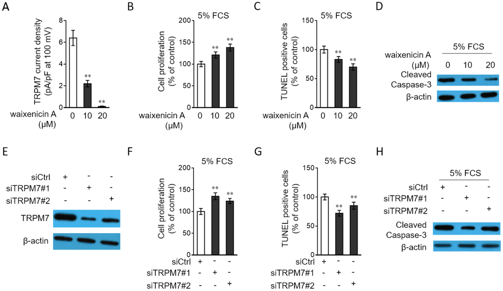TRPM7 downregulation in PAH PASMCs led us to explore whether it affects the proliferation and apoptosis of PASMCs, two hallmarks of PASMCs in PAH [27, 28]. To address this issue, waixenicin A, a potent and relatively specific inhibitor of TRPM7 ion channels [29, 30], was used to block its function. The inhibition of TRPM7 function by waixenicin A was confirmed by the drastically decreased density of TRPM7 currents, as compared with vehicle control (Figure 4A). The stimulative effects of 5% FCS on the proliferation (Supplementary Figure 1A) and apoptosis resistance (Supplementary Figure 1B) in PASMCs were firstly validated. Next, the result from BrdU incorporation assay showed that waixenicin A treatment significantly increased the proliferation of PASMCs stimulated with 5% FCS (Figure 4B). Further, PASMCs were stimulated with 5% FCS in the presence or absence of waixenicin A, and then apoptosis was detected by TUNEL assay. We found that waixenicin A treatment significantly reduced the number of apoptotic cells (Figure 4C). Consistently, as shown by Western blotting analysis, waixenicin A treatment also decreased the expression level of cleaved caspase-3 in PASMCs (Figure 4D). Furthermore, notably, Mg2+ anaplerosis via exogenous supplementation largely rescued the effects of waixenicin A treatment on the proliferation and apoptosis resistance in PASMCs (Supplementary Figure 2A–2C). Hence, these results describe that TRPM7 inhibition with waixenicin A increases proliferation and apoptosis resistance in PASMCs under the stimulation of 5% FCS in vitro, which could be at least in part attributed to impairment of Mg2+ intake.