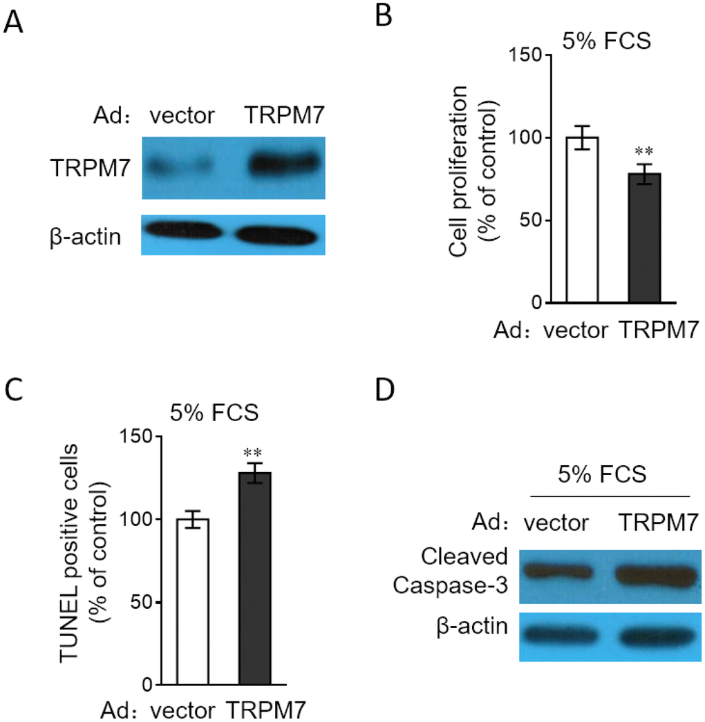 In order to consolidate the function of TRPM7 in PASMCs, we performed the enforced overexpression of TRPM7 in PASMCs through adenovirus infection. Adenovirus-mediated overexpression of TRPM7 in PASMCs was first verified by Western blotting analysis (Figure 5A). Consequently, we discovered that in contrast to TRPM7 inhibition or knockdown, TRPM7 overexpression decreased cell proliferation (Figure 5B) and meanwhile, increased the number of apoptotic cells (Figure 5C) and expression of cleaved caspase-3 (Figure 5D) in PASMCs stimulated with 5% FCS, therefore reinforcing the notion that TRPM7 functions as a negative regulator of proliferation and apoptosis resistance in PASMCs.