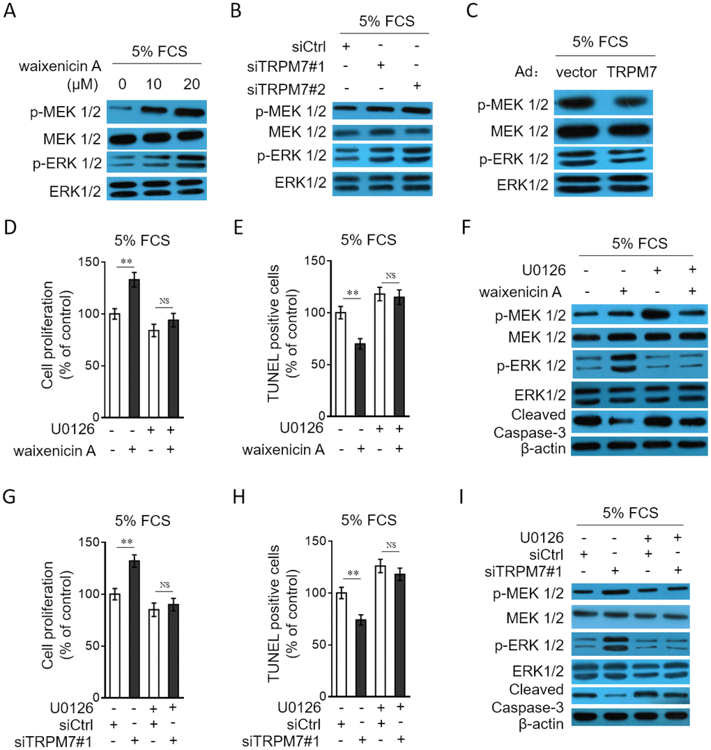 To gain a mechanistic insight into the molecular mechanisms by which TRPM7 affects the proliferation and apoptosis resistance in PASMCs, we focused on MEK/ERK pathway, since this pathway plays a critical role in regulating cell proliferation and apoptosis [31], and it’s also reported that this pathway mediates TRPM7 effect on vascular cell proliferation [20, 21]. Compared with normal culture, in PASMCs cultured with 5% FCS, the MEK/ERK pathway was activated (Supplementary Figure 3). We then tested whether TRPM7 manipulation affects the activation of MEK/ERK pathway in PASMCs. As shown, TRPM7 inhibition with waixenicin A (Figure 6A) or expression knockdown by siRNA transfection (Figure 6B) promoted the phosphorylation of MEK and ERK in PASMCs stimulated with 5% FCS, and oppositely, TRPM7 overexpression inhibited the phosphorylation of MEK and ERK (Figure 6C), illustrating that TRPM7 acts to suppress the activation of MEK/ERK pathway in PASMCs under this condition. To clarify the contribution of activated MEK/ERK pathway to the proliferation and apoptosis resistance increased by TRPM7 inhibition, we utilized the specific MEK inhibitor U0126 to block this pathway [32]. The results showed that the increased proliferation (Figure 6D) and apoptosis resistance (Figure 6E–6F) in PASMCs by waixenicin A treatment were completely abrogated in the presence of U0126, which efficiently blocked MEK/ERK pathway (Figure 6F). Furthermore, the proliferation (Figure 6G) and apoptosis resistance (Figure 6H–6I) increased by siRNA-mediated TRPM7 knockdown also vanished when MEK/ERK pathway was inhibited by U0126 (Figure 6I). Altogether, it could be concluded that TRPM7 inhibition- or knockdown-increased proliferation and apoptosis resistance in PASMCs rely on the activation of MEK/ERK pathway.