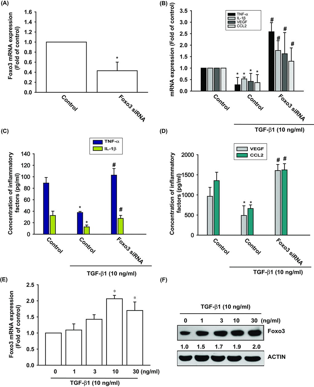 We have already established that TGF-β1 promotes levels of anti-inflammatory enzyme HO-1 expression in OASFs [6]. We therefore examined the anti-inflammatory effects of TGF-β1. Stimulation of OASFs with TGF-β1 diminished the mRNA and protein expression of inflammatory mediators, including TNF-α, IL-1β, VEGF and CCL2 (Fig. 1B-D). Both TGF-β1 and FOXO3 have been shown to be involved in the pathogenesis of OA, as well as the aging process [10,19]. However, the interplay between TGF-β1 and FOXO3 in the pathogenesis of OA and their impact on OASFs is unclear. Transfection of cells with FOXO3 siRNA suppressed FOXO3 expression (Fig. 1A) and reversed TGF-β1-inhibited the mRNA and protein expression of TNF-α, IL-1β, VEGF and CCL2 (Fig. 1B-D). We also found that TGF-β1 (0–30 ng/ml) stimulated the synthesis of FOXO3 mRNA and protein in a concentration-dependent manner (Fig. 1E and 1F). According to these data, TGF-β1 promotes anti-inflammatory effects through FOXO3 expression.