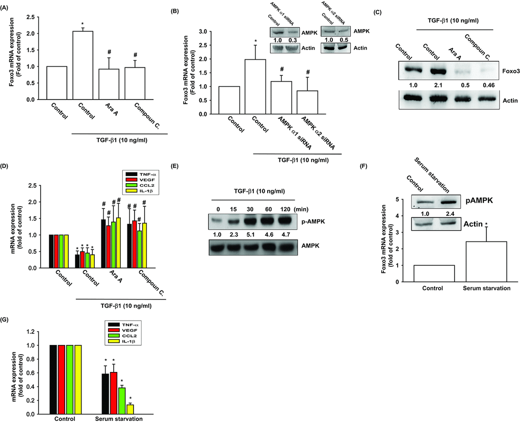 The AMP activated protein kinase (AMPK) is regulated by various stimuli, including TGF-β1 [24]. To validate the role of AMPK in TGF-β1-enhanced FOXO3 production, we pretreated OASFs with AMPK inhibitors (Ara A and compound C) or transfected them with AMPK α1/α2 siRNAs. The qPCR and Western blot assay confirmed significant mitigation of TGF-β1-enhanced FOXO3 synthesis in OASFs after the administration of AMPK inhibitors and AMPK α1/α2 siRNAs (Fig. 2A-C). AMPK inhibitors also reversed TGF-β1-inhibited the expression inflammatory mediators (Fig. 2D). TGF-β1-induced stimulation of OASFs led to a time-dependent increase in the phosphorylation of AMPK, as shown by Western blot (Fig. 2E). Increasing the AMP:ATP ratio leads to activate AMPK signaling. We also found serum starvation increased AMPK phosphorylation and FOXO3 synthesis as well as suppressed the expression of inflammatory mediators (Fig. 2F, G).