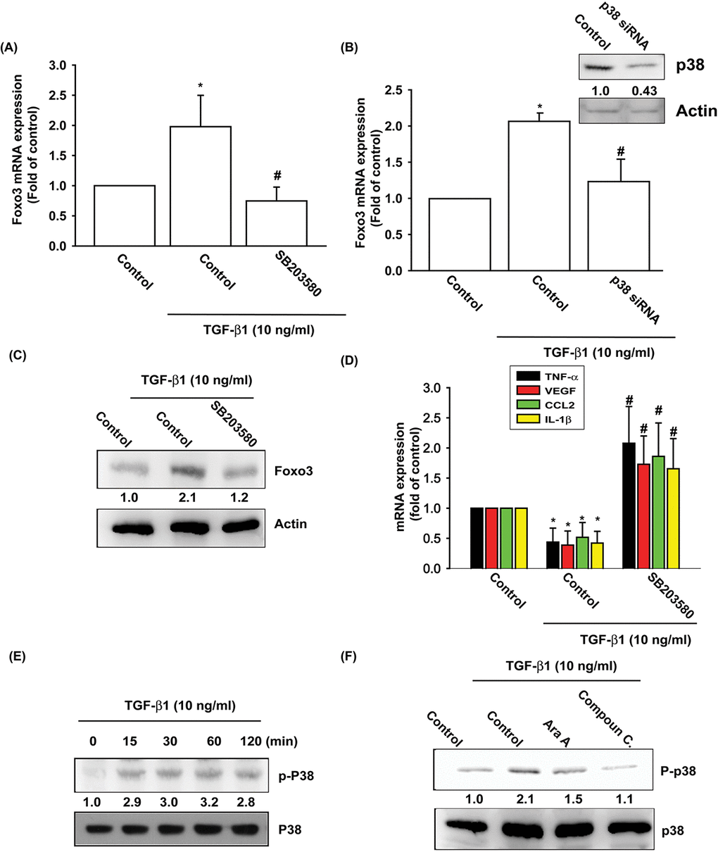 The p38, a mitogen-activated protein kinase involved in cell differentiation, aging and autophagy, regulates chondrocyte apoptosis and is involved in OA pathogenesis [25,26]. AMPK stimulates downstream p38 activity [27,28]. We pretreated OASFs with a p38 inhibitor (SB203580) and p38 siRNA prior to TGF-β1 administration. As shown in Fig. 3A-D, pretreatment with SB203580 or transfection with p38 siRNA significantly mitigated TGF-β1-enhanced FOXO3 synthesis and TGF-β1-inhibited the expression of inflammatory mediators. Under Western blot assay, TGF-β1 time-dependently stimulated the phosphorylation of p38 (Fig. 3E), and the TGF- β 1-induced p38 phosphorylation mitigated by AMPK inhibitors (Fig. 3F). These data demonstrate that TGF-β1 enhances FOXO3 expression through AMPK and p38 signaling pathways.