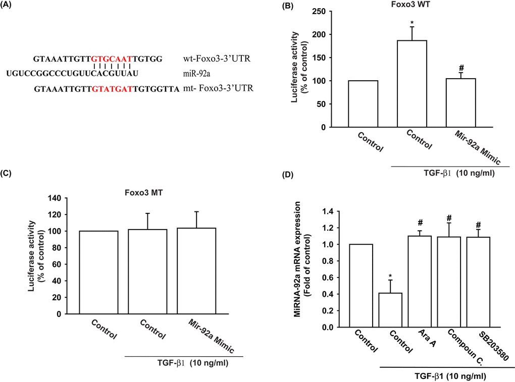 We also used the luciferase reporter vector, including the wild-type 3’UTR of FOXO3 mRNA (wt-FOXO3-3’UTR) and the vector harboring mismatches in the predicted miR-92a binding site (mt-FOXO3-3’UTR), to determine whether miR-92a regulates transcription of the FOXO3 gene (Fig. 5A). We showed that miR-92a mimic reduced TGF-β1-enhanced luciferase activity in the wt-FOXO3-3’UTR plasmid, but not in the mt-FOXO3-3’UTR plasmid (Fig. 5B and 5C). In addition, the AMPK inhibitors (Ara A and compound C) and the p38 inhibitor (SB203580) reversed TGF-β1-inhibited miR-92a expression (Fig. 5D). It appears that miR-92a directly suppresses FOXO3 transcription by binding to the 3'UTR region of the human FOXO3 mRNA, and that miR-92a expression is negatively regulated by AMPK and p38 phosphorylation induced by upstream TGF-β1 signaling.