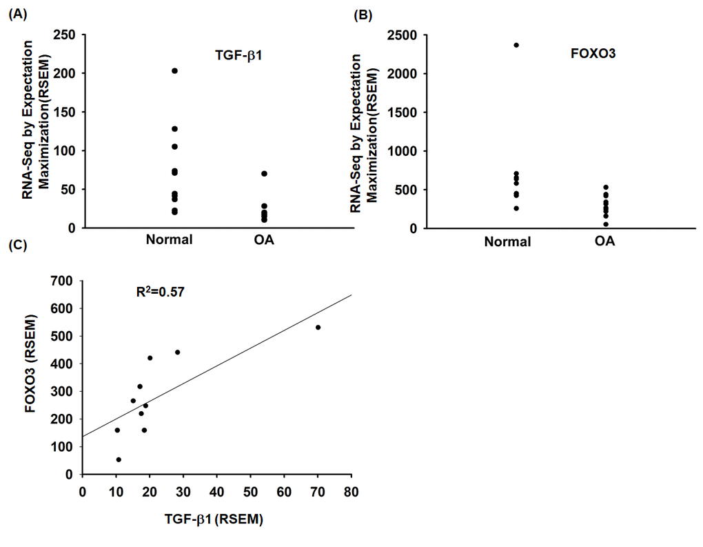 The homodimeric protein, transforming growth factor beta 1 (TGF-β1), binds to TGF-β type I (TGFBR1) and type II (TGFBR2) serine/threonine kinase receptors on the cell membranes of the target cells via Smad-dependent and Smad-independent pathways [6]. TGF-β1 signaling is altered during aging and is a driving force of OA progression [10,11]. TGF-β1 concentrations differ substantially between healthy and OA joints, and activate different signaling pathways [10]. To date, the differential signaling pathways between healthy and OA joints have not been fully understood. The forkhead box class O (FOXO) transcription factors are among the major mediators that regulate cellular aging and stress resistance. The mammalian FOXO family (i.e., FOXO1, FOXO3 and FOXO4) [12] regulates the expression of genes governing oxidative defense and DNA repair enzymes, and modulates the activity of the ubiquitin–proteasome system and the autophagic/lysosomal pathway [13–16]. Aberrant FOXO activity is found in the pathogenesis of various age-related diseases, including OA [17–19].
