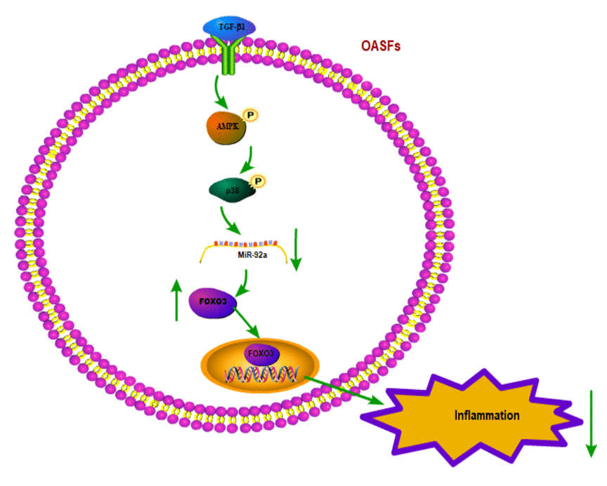 In summary, our study shows that the TGF-β1 in OASFs triggers the phosphorylation of AMPK and p38 and contributes to a decline in miR-92a synthesis. The decreased miR-92a expression enhances synthesis of the anti-inflammatory gene FOXO3 (Fig. 7). These results improve our understanding about the role of OASFs in the pathogenesis of aging and OA and may result in more effective therapy for OA patients.