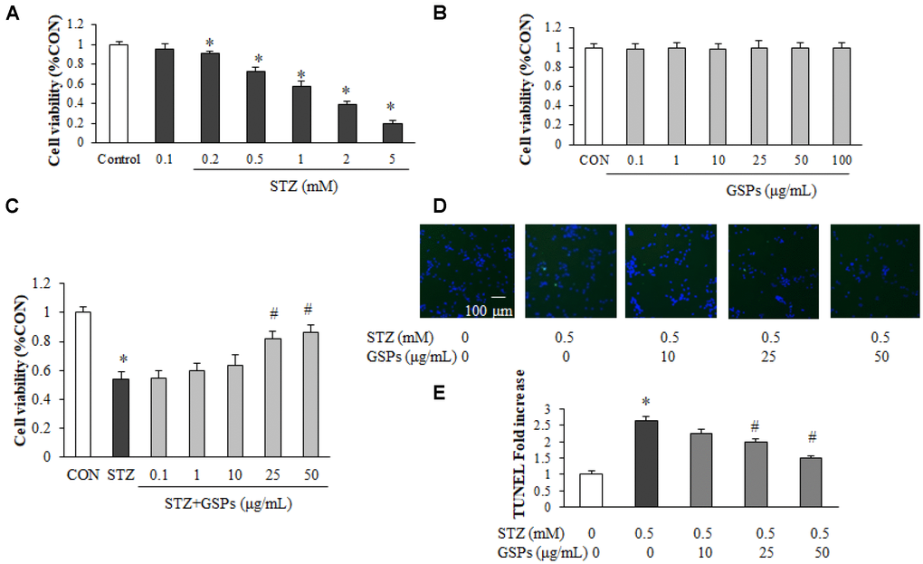To assess the neuroprotective effect of GSPs, primary cortical neurons were subjected to (3-(4,5-Dimethylthiazol-2-yl)-2,5-diphenyltetrazolium bromide (MTT) assay. We first examined the neurotoxicity of STZ, and the results showed that STZ with a concentration greater than 0.2 mM caused neuron loss in a dose-dependent manner (Figure 1A). The STZ dose was set to 0.5 mM for primary neuronal cells in all subsequent assays due to a 28.62% ± 4.22% reduction induced by 0.5 mM STZ treatment. As shown in Figure 1B, after treatment with GSPs (0.1 - 100 μg/mL) for 24 h, there was no significant difference of cell viability compared with that in the CON group, indicating that GSPs was nontoxic to primary cortical neurons under the treatment conditions. As demonstrated in Figure 1C, pretreatment with GSPs at the concentrations of 25, 50 μg/mL significantly attenuated cell death in the presence of STZ, whereas the concentrations of 0.1, 1 and 10 μg/mL GSPs did not show obvious effect. To further investigate the neuroprotective effects of GSPs on STZ-induced neuron loss, we evaluated apoptosis by using TdT-mediated dUTP Nick-End Labeling (TUNEL) staining in primary cortical neurons. As shown in Figure 1D and 1E, STZ increased the proportion of TUNEL-positive cells, which was significantly suppressed by pretreated with GSPs at the concentrations of 25 and 50 μg/mL. These results indicate that GSPs can counteract STZ induced neuron loss and apoptosis.
