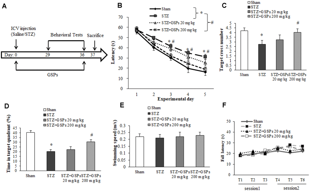 To test the motor coordination and balance, mice were examined by using the rotarod test. The results showed that there is no significant difference in the fall latency between the mice with ICV injection of STZ and the mice from the sham group (Figure 2F). Similarly, administration of different concentration of GSPs with pretreatment with ICV injection of STZ did not affect the fall latency (Figure 2F). These data indicate that STZ does not impair motor coordinator or balance, while GSPs did not affect the motor activity.