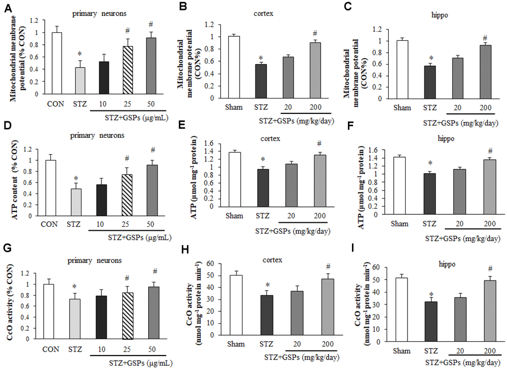In order to assess the effects of GSPs on mitochondrial function, we examined the levels of MMP, cellular ATP and the activity of CcO in vitro and in vivo. As shown in Figure 6A, a significant decrease in the fluorescent signal of rhodamine 123 was observed in primary cortical neurons exposed to STZ, indicating a significantly loss of MMP. However, an obvious increase in MMP was observed in cells pretreated with GSPs. Similarly, our results showed that the level of ATP (Figure 6D) and the activity of CcO (Figure 6G) were decreased in the presence of STZ, whereas this effect was reversed by administration of 200 mg/kg GSPs. Similarly, the levels of MMP (Figure 6B and 6C), cellular ATP (Figure 6E and 6F) and the activity of CcO (Figure 6H and 6I) were decreased in the cerebral cortex and hippocampus of the mice treated with STZ. In addition, the level of MMP was significantly decreased in the STZ group compared with that in the Sham group, whereas high dosage of GSPs significantly improved the level of MMP (Figure 6B and 6C). Administration of high dosage of GSPs significantly prevented the decrease of the ATP level (Figure 6E and 6F) and the activity of CcO (Figure 6H and 6I) in cerebral cortex and hippocampus of the mice treated with STZ as well. Taken together, STZ significantly decreases the levels of MMP, ATP and the activity of CcO, which could be rescued by administration of GSPs.