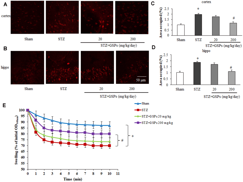 These results indicate that GSPs can prevent STZ-induced mitochondrial superoxide generation and mPTP opening in the cerebral cortex and hippocampus.