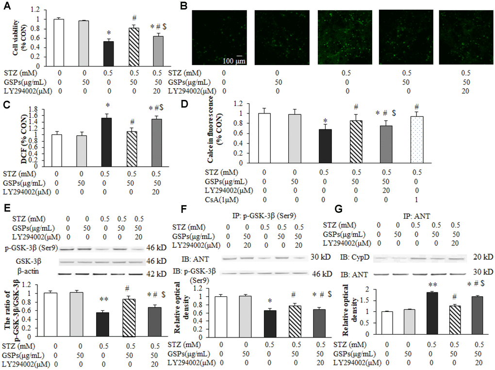 Previous studies have shown that mPTP is modulated by cyclophilin D (CypD) or adenine nucleotide translocator (ANT) [24]. As shown in Figure 9F and 9G, STZ significantly decreased the interaction between p-GSK-3β (Ser9) and ANT, and increased generation of the ANT/CypD complex. However, pretreatment of GSPs decreased the binding of ANT to CypD by promoting the interaction of p-GSK-3β (Ser9) and ANT, which was significantly blocked by LY294002. These results suggest that GSPs reduce GSK-3β-dependent mPTP opening by enhancing GSK-3β phosphorylation at its Ser9.