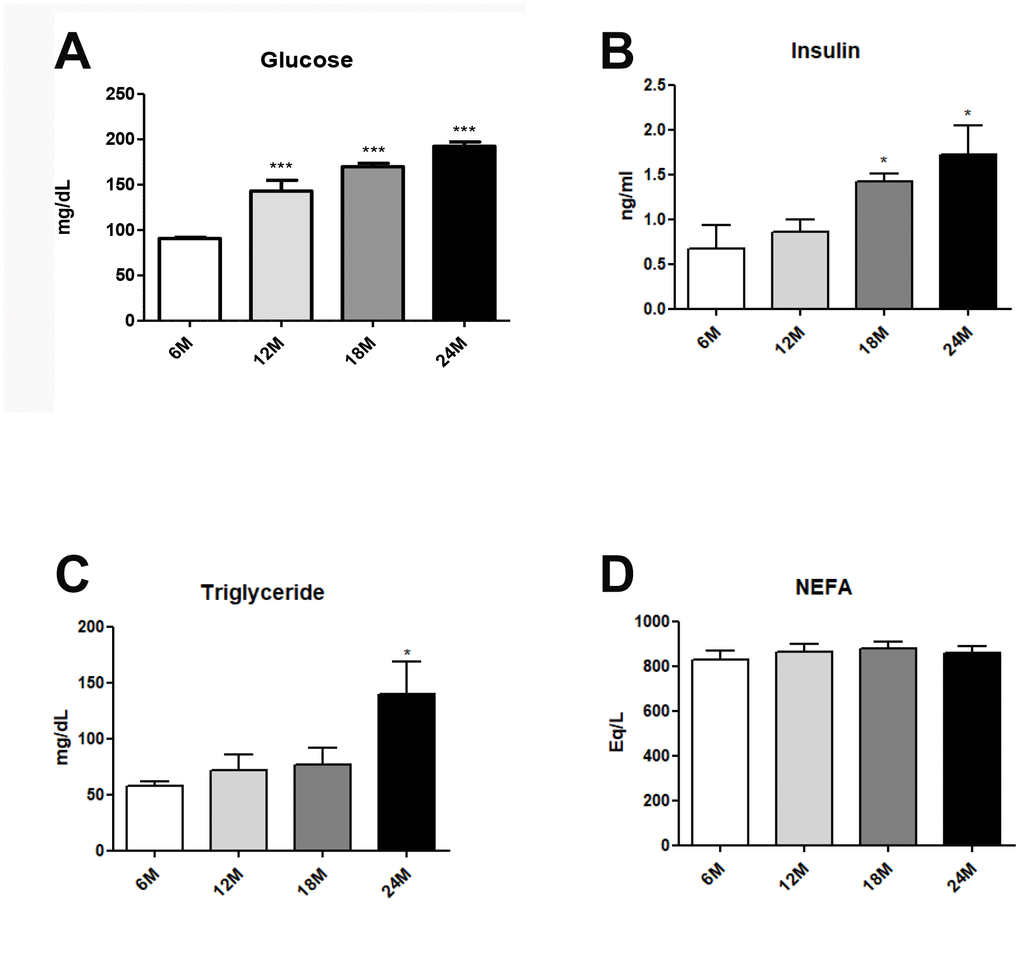 Obesity generally accompanies alterations in the blood lipid profile, which are closely associated with hepatic steatosis [26]. Blood lipid profiles were investigated in aged rats. Age-related hyperglycemia was significantly elevated fasting glucose (Figure 1A). However, hyperinsulimia and hypertriglyceridemia significantly elevated insulin levels (Figure 1B), and plasma TG levels (Figure 1C), as compared to age/sex-matched young animals. No age-related differences were found in the levels of plasma free fatty acid (NEFA) (Figure 1D). Our data strongly suggest that aging induces dyslipidemia and hyperglycemia.