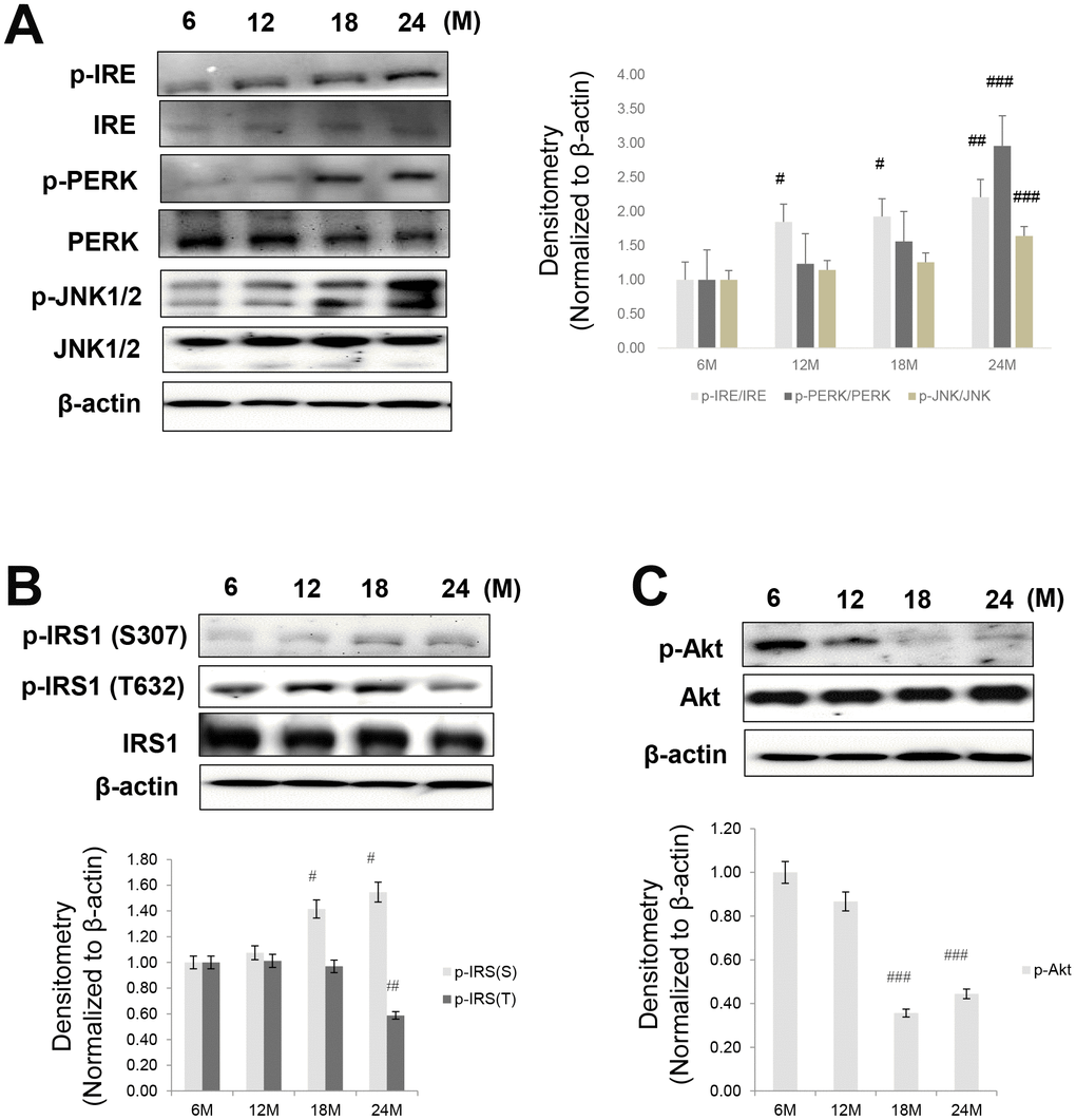 The ER is an organelle that known to regulate cellular calcium storage, protein synthesis, and protein folding. An accumulation of unfolded or misfolded proteins in the lumen of the ER induces ER stress and unfolded protein response (UPR) that has been related to diverse metabolic or aging-related diseases [23, 24]. The main UPR signaling cascades are initiated by three ER-localized protein sensors: inositol-requiring enzyme 1 (IRE1), protein kinase RNA-like endoplasmic reticulum kinase (PERK), and activating transcription factor 6α (ATF6α). ER stress-activated IRE1 stimulates c-Jun N-terminal kinase (JNK), which, in turn, phosphorylates serine residues in IRS-1, thereby inhibiting insulin receptor signaling [25] and limiting the activation of PI3K/Akt signaling in response to insulin. The reduced Akt activity leads to elevated nuclear FoxO activity. Understanding the mechanisms of FoxO1 action is of great importance as it may allow for the identification of new therapeutic targets for age-associated hepatic steatosis. Although detailed information is available on the molecular mechanisms underlying hyperglycemia and lipid accumulation, their relations with the presumed insulin signaling and FoxO1, remain unknown.