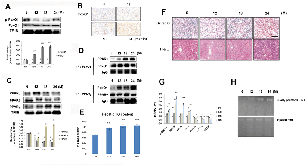 PPARs belong to the nuclear hormone receptor superfamily, comprising ligand-modulated transcription factors. PPARs heterodimerizes with retinoid X receptors (RXRs) and binds to PPAR response elements (PPRE) in the promoter region of specific target genes, regulating their transcription. Currently, three PPAR subtypes, PPARα, PPARβ, and PPARγ have been identified. Among them, PPARγ promotes adipogenesis, controls lipid accumulation in adipocytes, and regulates the expression of adipocyte-secreted proteins and adipocytokines (leptin and adiponectin) to reduce lipotoxicity [11] and hepatic lipid metabolism [12, 13]. Kim et al., [14] reported that in diabetic db/db mice, hepatic FoxO6 significantly induced hepatic PPARγ expression in insulin resistant liver, and consequently induced hepatic lipogenesis as well as increased hepatic fat content. However, the molecular interaction between FoxO1 and PPARγ in aging-related lipid accumulation by endoplasmic reticulum (ER) stress has not been reported.