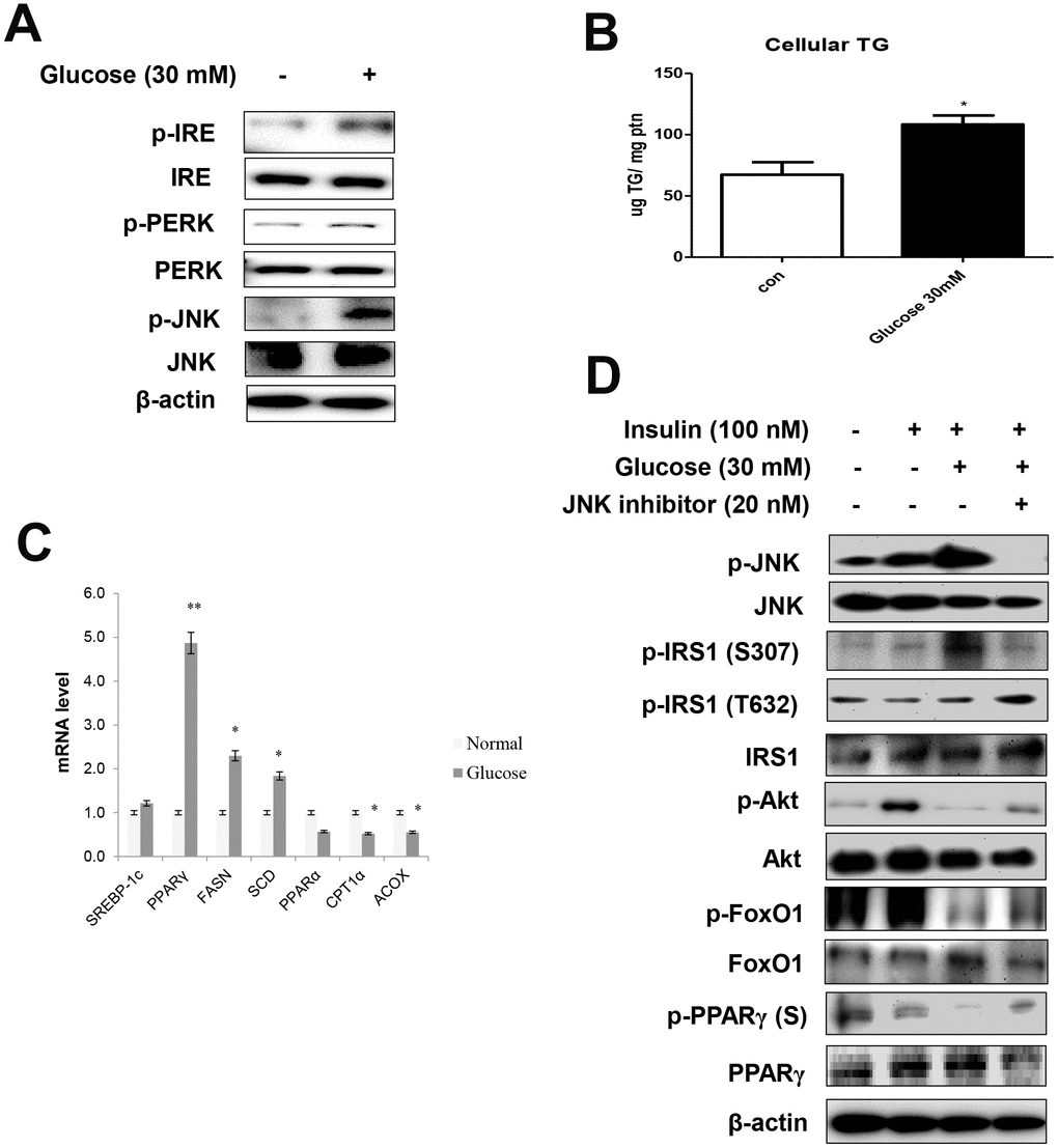 We examined the effects of ER stress activator and JNK inhibitor, PD98059, on insulin signaling, as well as FoxO1 and PPARγ phosphorylation. In these experiments, serum-starved AC2F cells were treated with PD98059 for 1 h prior to a 2 h treatment with 30 mM glucose with insulin (100 nM) for 10 min. Glucose enhanced ER stress, whereas the JNK inhibitor prevented glucose-induced FoxO1 dephosphorylation and insulin signaling and increased the phosphorylation of both FoxO1 and PPARγ through JNK signaling (Figure 4D). We further verified whether the ER stress activator, tunicamycin, affected FoxO1 and PPARγ expression (Supplementary Figure 3) in AC2F cells and found that ER stress-mediated FoxO1 induced lipid accumulation. Furthermore, siRNA-mediated FoxO1 knockdown markedly decreased lipid accumulation in AC2F cells. Taken together, these findings provide evidence that ER stress increase the expression of FoxO1 and PPARγ, leading to lipid accumulation.