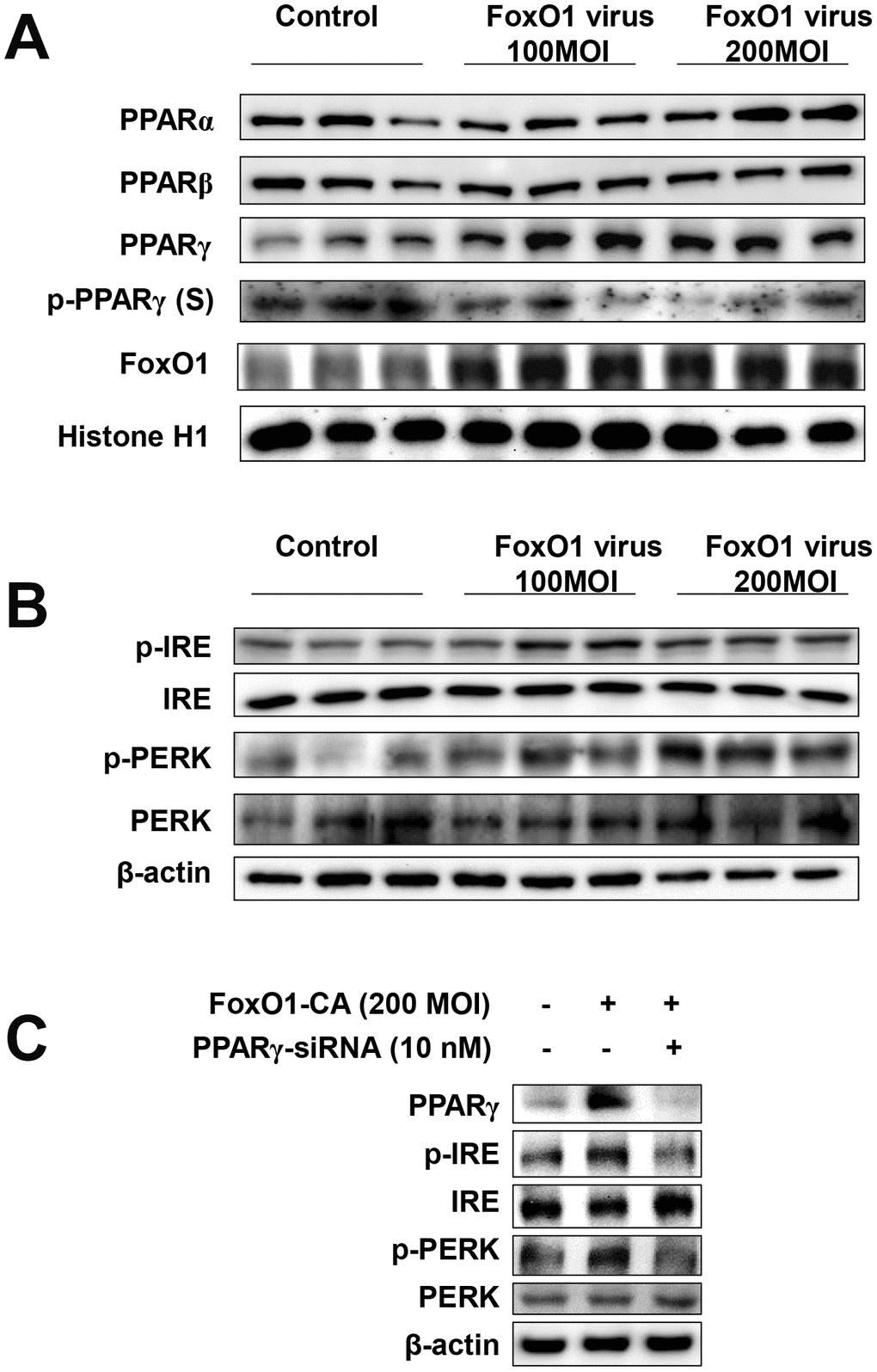 To determine whether FoxO1 plays a role in the functional relationships between lipogenesis genes and aberrant ER stress, we employed a viral system for the exogenous overexpression of FoxO1 in AC2F cells. AC2F cells were intravenously transfected with Adv-FoxO1-CA or empty vector and ER stress was assessed. We examined the expression of ER stress genes in FoxO1 virus-transduced AC2F cells. Cells were treated with or without different concentrations (100 and 200 MOI) of FoxO1-CA. As shown in Figure 5A, treatment with 100 and 200 MOI FoxO1 induced PPARγ levels. However, β-oxidation regulated transcriptional factors such as PPARα and PPARβ were not affected in FoxO1-transduced hepatocytes (Figure 5A). To verify the hypothesis that FoxO1 transactivates the ER UPR proteins, the expression of these genes was assessed in FoxO1 virus-transduced AC2F cells. ER UPR proteins were found to be induced in the FoxO1-overexpressing but not the mock-transfected cells. Taken together, these results indicated that FoxO1 promotes the activation of the ER UPR proteins, PERK and IRE (Figure 5B). We examined the expressions of ER stress genes under condition of FoxO1 overexpression with PPARγ-siRNA knockdown in cells. As shown in Figure 5C, overexpression of FoxO1 induced ER stress gene levels. Otherwise, ER stress genes were reduced by FoxO1 overexpression with PPARγ-siRNA. Collectively, these data indicate that PPARγ induced ER stress genes suggesting that FoxO1-mediated PPARγ may lead to ER stress.