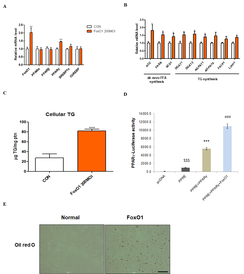 We used the AC2F liver cell line to further investigate the functional role of FoxO1 in hepatic steatosis. We hypothesized that FoxO1-induced lipid accumulation in the liver occurs, at least in part, via PPARγ activation. As a transcription factor, PPARγ plays an important role in hepatic steatosis by inducing lipogenesis-related gene expression [33–35]. We verified whether FoxO1 induces PPARγ mRNA in AC2F cells. Notably, no change in the expression of other transcription factors related to lipid metabolism, such as PPARα, PPARβ, SREBP-1c, and ChREBP, was detected (Figure 6A). However, FoxO1 adenoviral overexpression markedly increased the transcription of target genes such as ACC, FASH, SCD1, DGAT1, DGAT2, AGPAT1, AGPAT9, FATP1, and lipin1 (Figure 6B). We explored the effect of FoxO1 overexpression on lipid accumulation in AC2F cells and found a marked FoxO1-dependent increase in TG concentration (Figure 6C). Moreover, FoxO1 caused the transcriptional activation of PPARγ, as determined by PPARγ luciferase assay (Figure 6D). These results were confirmed by liver cell Oil red O staining, showing that fat accumulates in FoxO1-overexpressing cells (Figure 6E). Based on these findings, we suggest that FoxO1 induces lipid accumulation through the upregulation of lipogenesis genes.