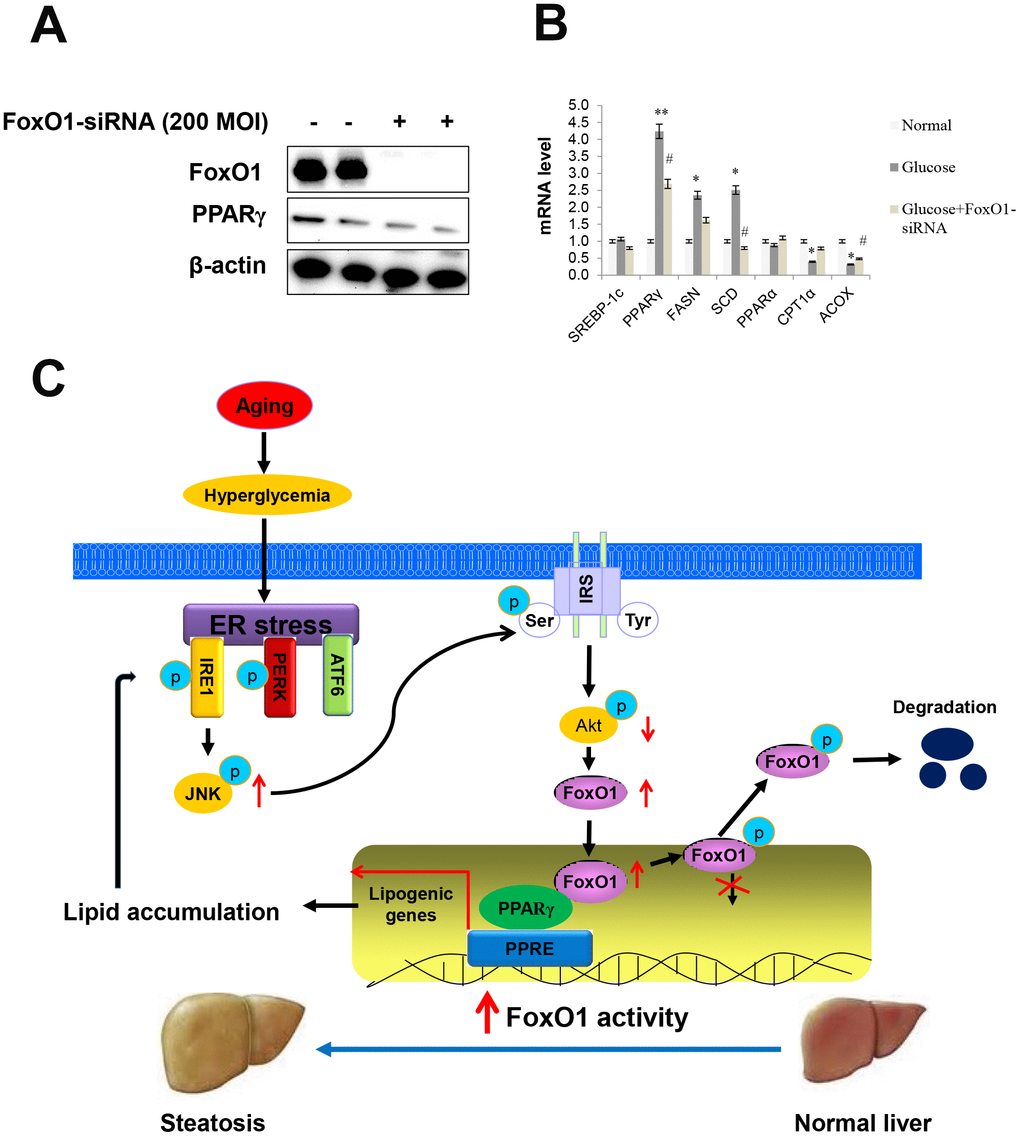 In the present study, we investigated hepatic steatosis in relation to hyperglycemia in the context of aging, as well as FoxO1 interaction with PPARγ during ER stress, in both the liver and AC2F cells, to achieve a better understanding of the molecular mechanisms involved in hepatic lipogenesis.