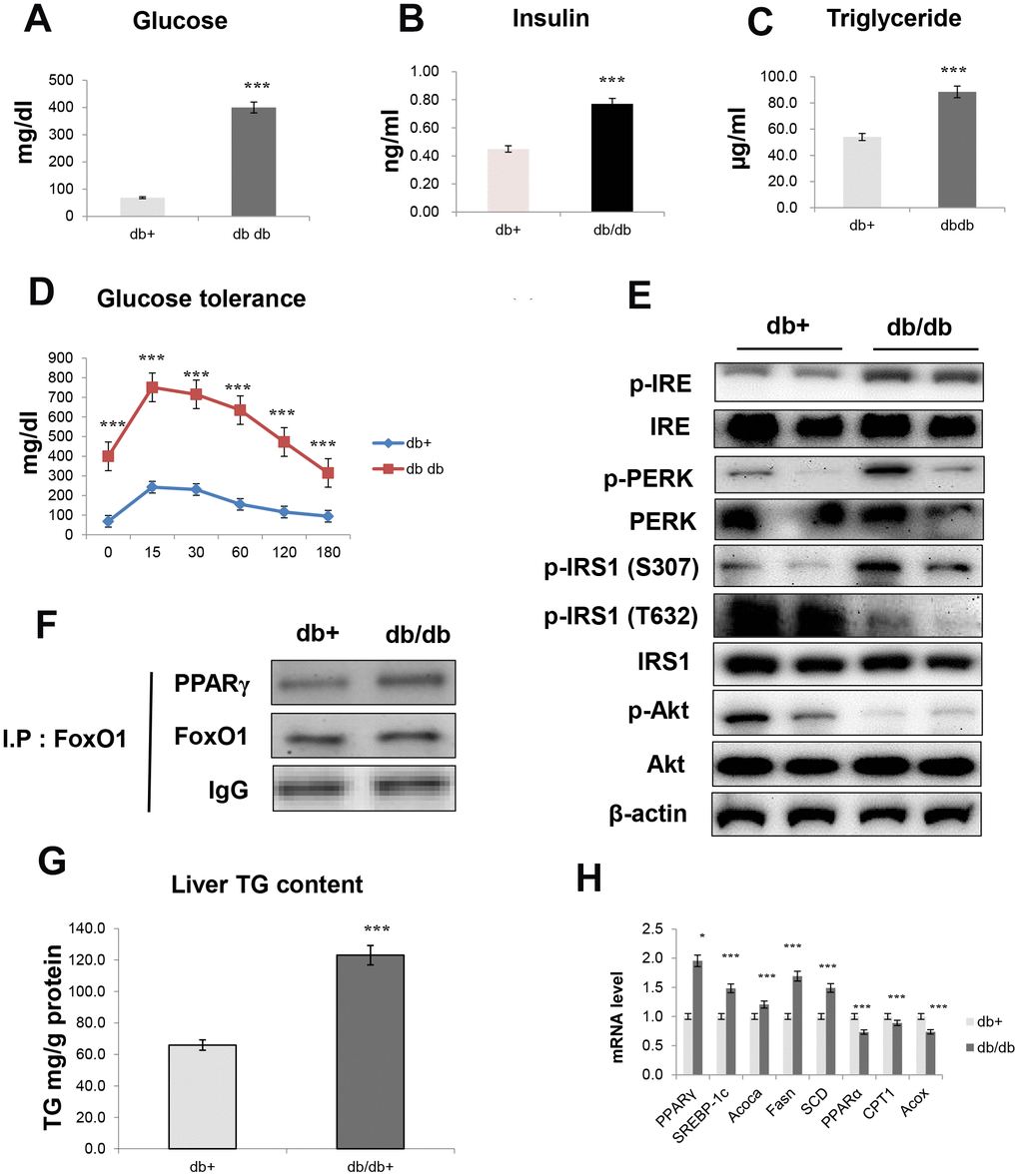 In aged animals, insulin resistance was significantly increased and correlated with the pathogenesis of fasting hyperglycemia. We studied insulin resistance and hepatic steatosis in db/db mice. As shown in Figure 8, obese mice developed hyperinsulinemia, culminating in substantially higher fasting glucose (Figure 8A), insulin levels (Figure 8B), TG levels (Figure 8C), and glucose tolerance (Figure 8D), as compared to age-matched controls. Notably, insulin resistance models exhibited significantly increased expression of IRE and PERK, which are all key genes in ER stress. Furthermore, IRS/Akt signaling was suppressed in the liver of db/db mice (Figure 8E). In addition, our IP experiments showed that an interaction between FoxO1 and PPARγ was triggered in the liver of obese mice (Figure 8F).