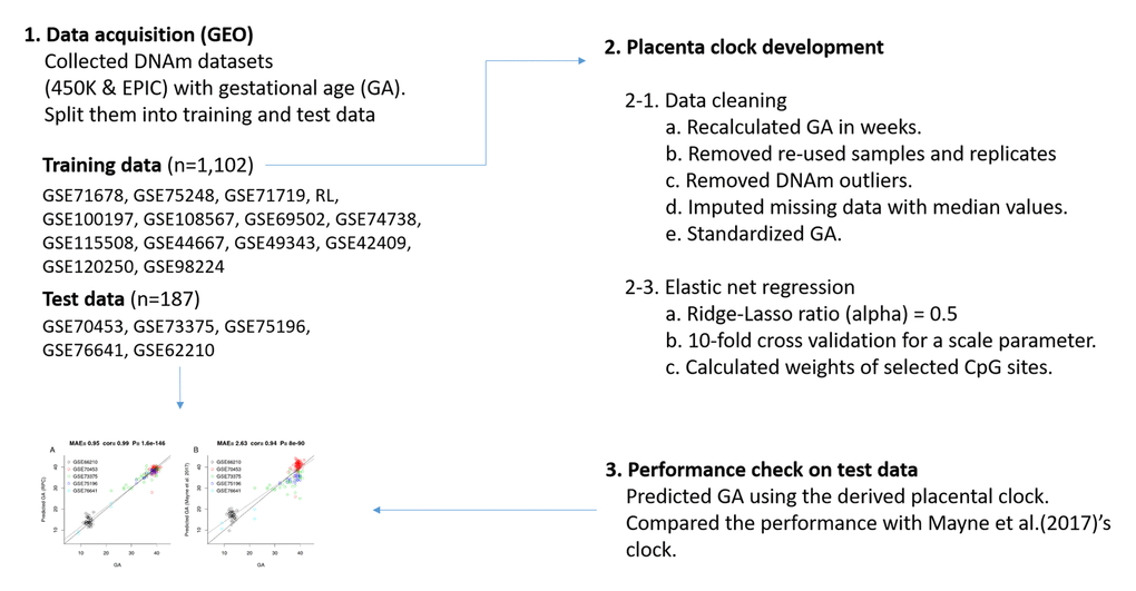 We collected publicly available data from Gene Expression Omnibus (GEO) using the GEOparse Python package (Python 3.6.5: Anaconda, Inc.). Table 1 details each dataset. GSE71678 examined the correlation between placental DNAm and arsenic exposures in the New Hampshire Birth Cohort Study [53]. GSE75248 examined placental DNAm in relation to newborns’ neurobehavioral outcomes [54]. GSE71719 studied the association between DNA hydroxymethylation and gene expression using placental samples [55]. The Robinson laboratory (RL) at the University of British Columbia (Vancouver, BC, Canada) transferred placental DNAm data that are publicly available in the GEO database. GSE100197 and GSE98224 were studies that aimed to find placental DNAm profiles for preeclampsia and intrauterine growth restriction in women recruited at the University of British Columbia Women’s and Children’s Hospital (Vancouver, Canada) and at Mount Sinai Hospital (Toronto, Canada), respectively [56]. GSE108567 investigated batch effects in DNAm micro array data [57]. GSE69502 explored DNAm patterns in multi-tissue samples (placental chorionic villi, kidney, spinal cord, brain, and muscle) from fetuses that were aborted due to neural tube defects [58]. GSE74738 aimed to identify differentially-methylated imprinted regions using a genome-wide approach [59]. GSE115508 compared DNAm patterns in cases of placental inflammation (acute chorioamnionitis) with those in unaffected controls [60]. GSE44667 studied the association between placental DNAm in gene enhancer regions and early-onset preeclampsia [61]. GSE49343 investigated placental DNAm with trisomy and preeclampsia [62]. GSE42409 enhanced probe annotation of Illumina HumanMethylation 450K BeadChip to facilitate biologically meaningful data interpretation [63]. GSE120250 examined the impact of assisted reproductive technology on the placental DNA methylome [64]. GSE70453 conducted epigenome-wide and transcriptome-wide analyses of gestational diabetes [65]. GSE73375 examined DNAm in the preeclamptic placenta in relation to the transforming growth factor beta pathway [66]. GSE75196 studied different DNAm patterns in patients with preeclampsia and unaffected controls [67]. GSE76641 studied the transcriptional and DNAm trajectory of 21 organs during fetal development [68].