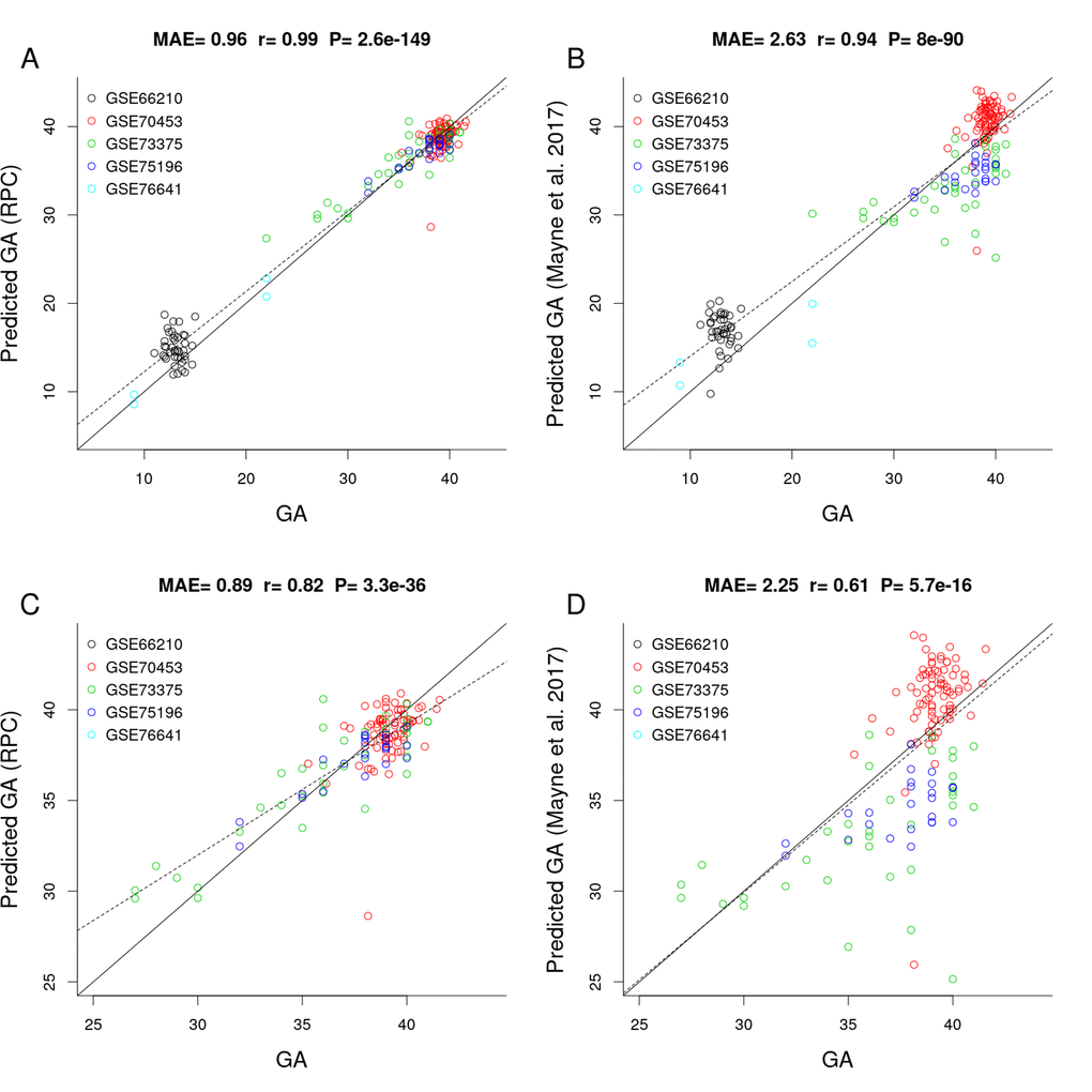 Figure 2 shows the results of a comparison between the RPC and the placental clock from Mayne et al. (2017) in independent test data (test n=187, Table 1). The predictive accuracy of the placental clocks was quantified using the median absolute error (MAE, defined as the median absolute deviation between predicted GA and observed GA), and the degree of the linear association between predicted GA and observed GA was measured using the Pearson correlation coefficient (r). According to both measures, the RPC (MAE=0.96 weeks; 95% confidence interval (CI) [0.88, 1.19], r=0.99; 95% CI [0.98, 0.99]) outperformed Mayne’s placental clock (MAE=2.63 weeks; 95% CI [2.17, 3.01], r=0.94; 95% CI [0.92, 0.96]). Note that Mayne’s placental clock underestimated GA in two data sets: GSE73375 (green dots) and GSE75196 (blue dots), and overestimated GA in two other data sets: GSE66210 (black) and GSE70453 (red).