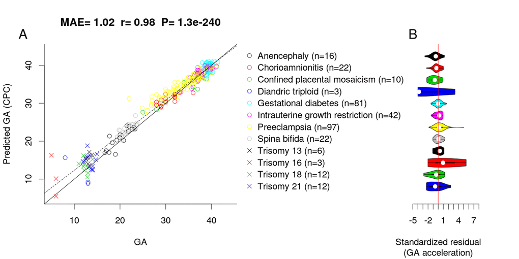 To assess whether adverse pregnancy conditions influence the epigenetic GA estimate, we applied the CPC to placental samples associated with chromosomal abnormalities (confined placental mosaicism, diandric triploidy, trisomy 13, 16, 18 and 21), neural tube defects (anencephaly and spinal bifida), intrauterine growth restriction, maternal complications (gestational diabetes and preeclampsia), and chorioamnionitis (test, n=326). Interestingly, the CPC accurately predicted the GA of fetuses with the above-mentioned conditions (MAE=1.02, r=0.98, Figure 3A) even though the CPC was constructed using unaffected control samples only.