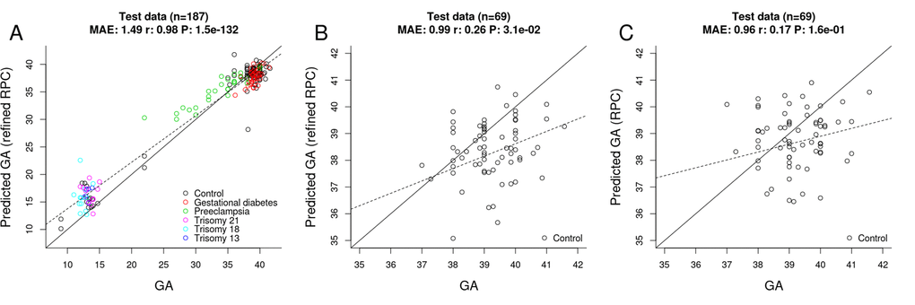 Toward this end, we selected "uncomplicated" term placental samples (n=733) from the training set used for the original RPC. Further, we restricted the penalized regression model analysis to the 558 CpGs that make up the original RPC. The penalized regression model automatically selected 395 CpG sites out of the 558 sites (Supplementary File 1). We find that the "refined" RPC for uncomplicated term pregnancies leads to highly accurate GA estimates (MAE=1.49, r=0.98, Figure 4A) in the RPC’s test set (n=187).