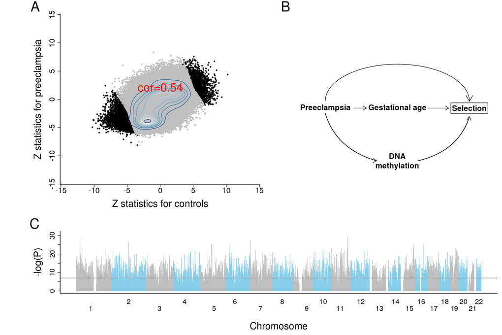 We briefly report the results from an epigenome wide association study (EWAS) of GA to demonstrate the profound effect of GA on placental DNAm levels. To protect against confounding by preeclampsia, we conducted EWAS in two separate strata: first, for placental samples from control pregnancies (n=831); second, for placental samples from pregnancies with preeclampsia (n=70). We combined the summary statistics from the two EWAS using Stouffer's method for meta-analysis [38]. The two EWAS summary statistics presented consistent DNAm-GA correlations across 441,870 autosomal CpGs (Figure 5A).