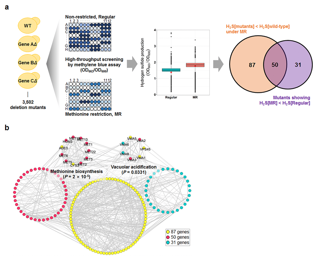Next, we conducted high-throughput hydrogen sulfide screening for the MR media with the yeast knockout collection (Fig. 1a). For this screening process, we used the methylene blue assay, in which the blue color changes to colorless upon hydrogen sulfide production. During this screening, two optical densities were measured simultaneously; one at OD663 to determine hydrogen sulfide production and another at OD600 to determine cell mass. These measurements were then used to calculate hydrogen sulfide production per cell. Compared to that in regular media, most of the tested strains, including wild-type, consistently showed low cell mass during the stationary phase (Fig. S2) and increased hydrogen sulfide production (Fig. 1a) in the MR media. Consequently, average hydrogen sulfide production per cell dramatically increased in the MR media. To identify the genes that regulated the increase in hydrogen sulfide production under the MR condition, two analytical strategies were applied to the screening data (Fig. 1a): 137 deletion mutant strains were selected to produce lesser hydrogen sulfide than the wild-type in MR media (Table S2; fold-change < -1.5; FDR-adjusted p-value < 0.05) and 81 deletion mutant stains were selected to exhibit no increase in hydrogen sulfide production under MR condition (Table S3; hydrogen sulfide production ratio between MR and regular media < 1; FDR-adjusted p-value < 0.05). Interestingly, 50 genes resided in the intersection between two independently performed comparisons (Fig. 1a). Next, we carried out Gene Ontology analysis for a total of 168 genes obtained from both analyses and found that genes involved in methionine biosynthesis (11 genes; p-value = 0.0000) and vacuolar acidification (7 genes; p-value = 0.0331) were significantly enriched (Fig. 1b). Therefore, we surmised that these two pathways (methionine biosynthesis and vacuolar acidification) possibly played a role in regulating hydrogen sulfide production under MR condition.