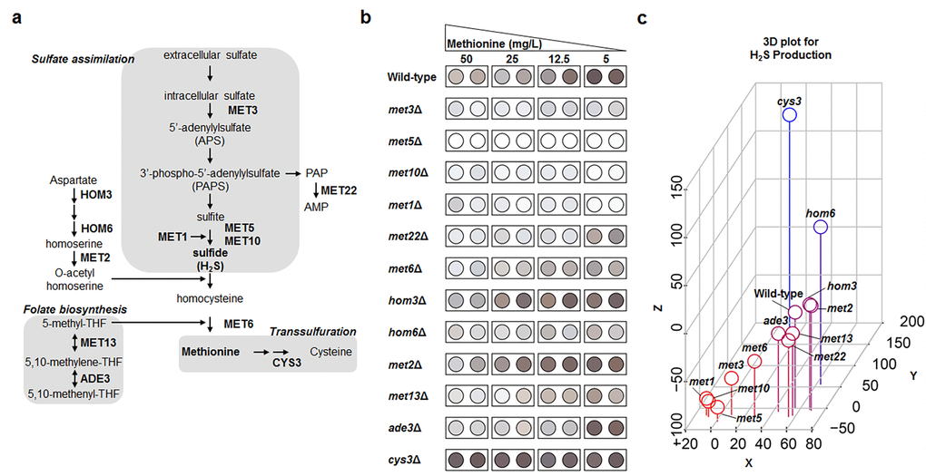 Based on the high-throughput methylene blue assay, methionine biosynthesis and vacuolar acidification were predicted to be involved in the regulation of hydrogen sulfide production under MR condition. Next, an alternative hydrogen sulfide detection assay was further performed to confirm these results owing to the pH dependency of methylene blue color change. Thus, we measured hydrogen sulfide production in deletion mutant strains associated with methionine metabolism (Fig. 2a) and vacuolar acidification under various methionine concentrations (50, 25, 12.5, and 5 mg/L) using lead acetate assay (Fig. 2b, S3, and S4). Methionine concentration showed a strong negative correlation with hydrogen sulfide production in wild-type yeast cells (Fig. 2b), which indicated reduced methionine uptake to be very effective in increasing hydrogen sulfide production. This phenomenon was also observed in most deletion mutant strains whose vacuolar acidification pathway genes were knocked out (Fig. S4). In contrast, all deletion mutant strains associated with sulfate assimilation, including met1Δ, met3Δ, met5Δ, and met10Δ, failed to increase hydrogen sulfide production to wild-type levels under MR conditions (Fig. 2b). These differences in hydrogen sulfide production were analyzed in following 3 ways and are shown in the 3D plot (Fig. 2c). For each strain, we subtracted the hydrogen sulfide amounts under regular condition from those under MR condition ([H2S]MR – [H2S]Reg; x-axis). For regular condition, we subtracted the wild-type hydrogen sulfide amount from each deletion mutant hydrogen sulfide amount ([H2S]mutant in regular – [H2S]WT in regular; y-axis). The values for z-axis ([H2S]mutant in MR – [H2S]WT in MR) were calculated in the same way as those for the y-axis, except that they were obtained under MR condition. Interestingly, the four deletion mutant strains exhibiting defective sulfate assimilation were observed in the bottom left corner of the 3D plot, thus showing greatly reduced hydrogen sulfide production when compared to the wild-type under MR condition. Consequently, it also meant that the sulfate assimilation pathway was crucial for increasing hydrogen sulfide production under MR condition. Therefore, we surmised that the sulfate assimilation pathway may possibly have a regulatory role in upregulating hydrogen sulfide production when methionine uptake is reduced.