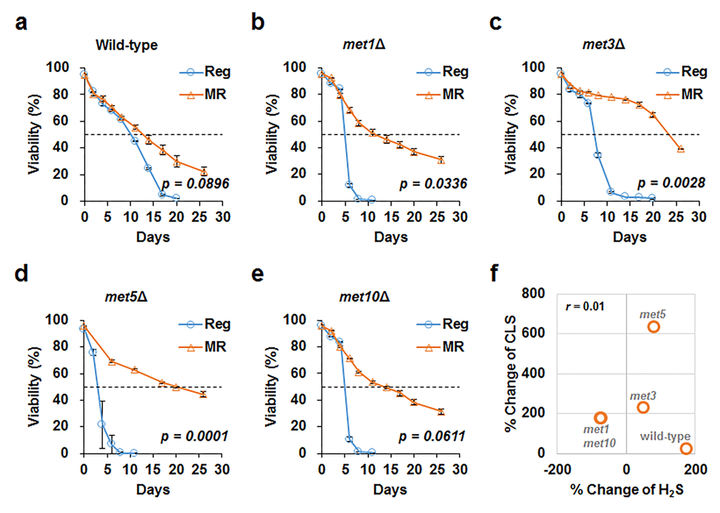 MR mimics many aspects of CR-mediated benefits, including lifespan extension and increased hydrogen sulfide production [10,13]. Increased hydrogen sulfide levels are particularly considered to be a mediator of lifespan extension under CR condition. In this regard, we assessed the effect of increased hydrogen sulfide production on lifespan under MR condition. Previously, DeLuna and his colleagues identified yeast aging genes from the stationary phase survival data of yeast single gene knockout mutants using an automated chronological lifespan assay [14]. Upon correlating our hydrogen sulfide production data against this genome-wide chronological lifespan data, no significant correlation between hydrogen sulfide production and lifespan was observed in the deletion mutant strains (correlation value was -0.009 and -0.151 under regular and MR conditions; Fig. S5). To demonstrate this experimentally, deletion mutants that exhibited defective sulfur assimilation and failed to increase hydrogen sulfide production in MR media were examined. Although these deletion mutants showed shorter lifespans than the wild-type in regular media, their lifespans were observed to extend at par with that of the wild-type under MR condition (Fig. 3 and Table S3). As a result, MR-mediated lifespan extension was concluded to be maintained independent of hydrogen sulfide production in all tested deletion mutants (Fig. 3f).