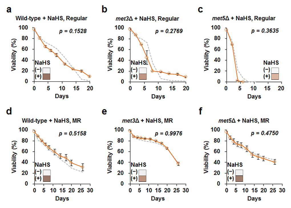 To better understand the role of hydrogen sulfide in lifespan, we added a hydrogen sulfide donor, sodium hydrosulfide (NaHS), to wild-type cells grown in regular and MR media, i.e., the cells were treated thrice (6, 24, and 48 h after inoculation) with 5 µM NaHS. However, lifespan was not observed to extend by adding this small concentration of NaHS under both regular and MR conditions (Fig. S6). Next, we tested the effect of a much higher concentration of NaHS (50 μM) on wild-type, met3Δ, and met5Δ strains at the culture starting point (Fig. 4 and Fig. S7). Whereas NaHS markedly increased hydrogen sulfide production, lifespan remained unchanged after NaHS treatment in all tested strains under regular and MR conditions. Therefore, we concluded that increased extracellular hydrogen sulfide production was not directly related to lifespan extension under the MR condition.
