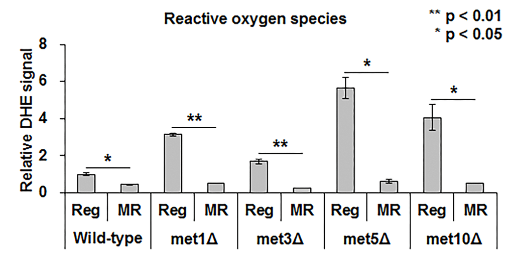 Recent studies suggested that hydrogen sulfide protected cells from oxidative stress by reducing ROS or increasing antioxidant production [15]. Hence, we examined the relation between ROS and MR-mediated lifespan extension and hydrogen sulfide production. Under regular condition, deletion mutants produced about 2 to 6-fold higher ROS levels than the wild-type (Fig. 5). However, no noticeable difference in the ROS levels was observed between mutants and the wild-type upon methionine restriction (Fig. 5). Thus, all strains, including the wild-type and deletion mutants, showed decreased ROS levels via MR. Although this suggested a relation between MR-mediated decrease in ROS levels and lifespan extension under MR condition, it did not necessarily associate the process with changes in hydrogen sulfide production via MR.