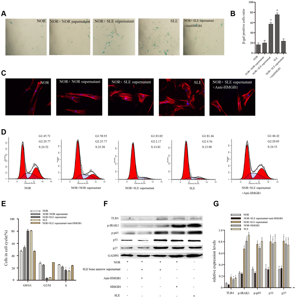 To further determine the effects of SLE bone marrow microenvironment on senescence of BM-MSCs, bone marrow supernatant was collected and used to stimulate BM-MSCs. Our results showed there were more SA-β-gal-positive cells in BM-MSCs when treated with bone marrow supernatant from SLE patients, interestingly, which could be reversed by a neutralizing anti-HMGB1 monoclonal antibody (Figure 2A, 2B). Furthermore, Immunofluorescence analysis showed that the distribution of F-actin in BM-MSCs was disordered after treatment with bone marrow supernatant from SLE patients (Figure 2C). The G1 phase was induced when normal BM-MSCs were treated with bone marrow supernatant from SLE patients by cell cycle analysis (Figure 2D, 2E). Western blotting analysis showed that expressions of cell cycle relation proteins, p53 and p27 were high in BM-MSCs treated by SLE bone marrow supernatant (Figure 2F). Anti-HMGB1 mAb treatment in SLE bone marrow supernatant did not lead to any significant changes in F-actin distribution and G1 phase. TLR4, one of HMGB1 receptors, can modulate MSCs function, trigger intracellular signaling pathways, and lead to the induction of inflammatory cytokines [12]. To discover the mechanism of bone marrow supernatant in the senescence of MSCs from SLE patients, we examined the expression of components of TLR4/NF-κB pathway. As shown in Figure 2F, bone marrow supernatant from SLE patients promoted the expression of TLR4 and its proteins expressed by its downstream regulated genes, p-IRAK1 and p-p65 (Figure 2F, 2G). These results confirmed that inflammatory microenvironment played facilitation to senescence of BM-MSCs, and HMGB1 had great significance.
