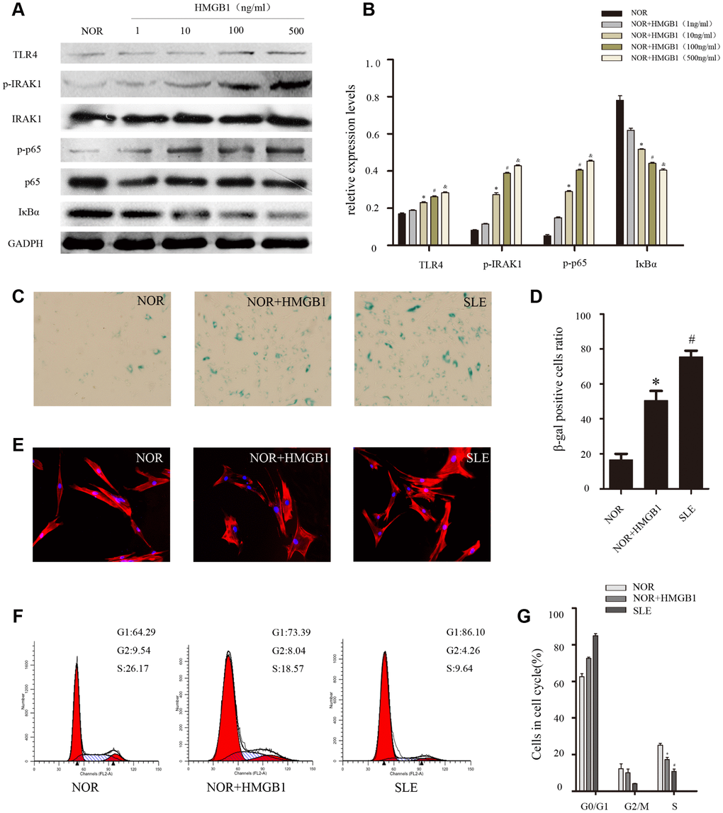 To further confirm the role of HMGB1 in the senescence of MSCs from SLE patients, different concentrations of HMGB1(1,10,100,500ng/ml) were used to stimulate BM-MSCs, which resulted in the activation of TLR4/NF-κB signaling pathway and the senescence of BM-MSCs. We discovered that HMGB1 promoted TLR4 expression at a concentration of 10-100 ng/ml and achieved maximal effects at doses of 100-500 ng/ml (Figure 3A, 3B). Thus, 48 h of treatment with 100 ng/ml of HMGB1 was used in the subsequent experiments. Then, we explored the effects of HMGB1 on the senescence of BM-MSCs from SLE patients and found that there were more SA-β-gal-positive cells in the BM-MSCs from normal persons when treated with HMGB1 (Figure 3C, 3D). Furthermore, after treatment with HMGB1, the distribution of Factin in BM-MSCs was disordered (Figure 3E). In addition, G1 phase was induced via cell cycle analysis (Figure 3F, 3G). Our results showed that HMGB1 could activate the expression of TLR4/NF-κB signaling and promoted cellular senescence in normal BM-MSCs in vitro, which further implied that the TLR4/NF-κB signaling pathway may play an essential role in the senescence of SLE BM-MSCs.