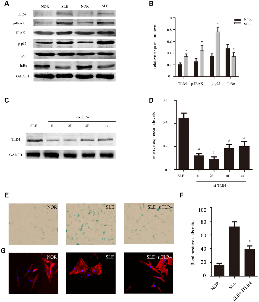 Previous studies and our experiment results have shown that SLE MSCs exhibited signs of senescence [7]. To further determine the effects of the TLR4/NF-κB signaling pathway on MSCs senescence. We next studied the expression of components of the TLR4 signaling pathway in BM-MSCs by western blotting. The results showed that expressions of TLR4, p-IRAK1 and p-p65 were clearly increased in SLE BM-MSCs compared to that in normal persons, and degradation of IκBα was induced in SLE BM-MSCs (Figure 4A, 4B). Next, TLR4-siRNA was used to knockdown the expression of TLR4 in SLE BM-MSCs to clarify the correlation between TLR4 signaling and cellular senescence. SLE BM-MSCs were transfected with TLR4-siRNA#1–4 or control siRNA. After 48 h, the levels of TLR4 were evaluated by western blot analysis. It was found that TLR4-siRNA#2 significantly knocked down the expression of TLR4 compared with the control siRNA (Figure 4C, 4D). Furthermore, the ratio of SA-β-gal-positive cells (Figure 4E, 4F) and the distribution of F-actin (Figure 4G) in BMMSCs from SLE patients was effectively reversed after treatment with TLR4-siRNA. These results further implied that. the TLR4 signaling pathway might play an important role in the senescence of SLE BM-MSCs